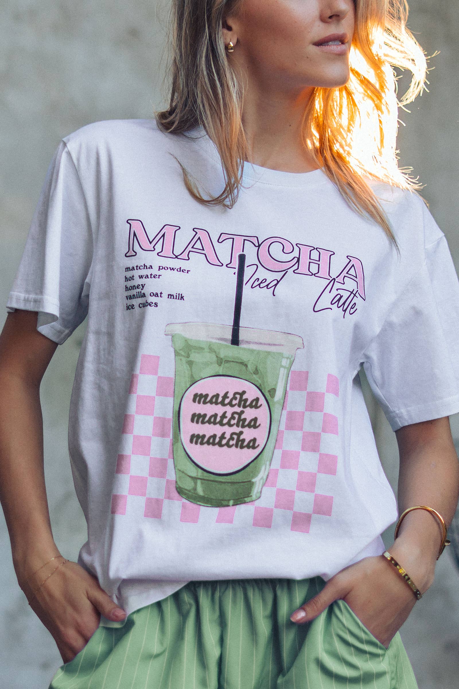 Top Details: "Matcha Iced Latte" graphic with ingredient list