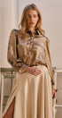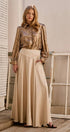Make a shimmering statement with this textured bronze metallic blouse. Designed to bring effortless glamour to any holiday or evening look, its lustrous fabric catches the light beautifully. The classic button-down silhouette is elevated with dramatic puff sleeves, creating a chic and festive piece. Material: Textured metallic fabric Design: Classic button-down front with a polished collar Details: Features statement puff sleeves and wide buttoned cuffs Sizing Pack: S-L (2-2-2) Origin: Made in China