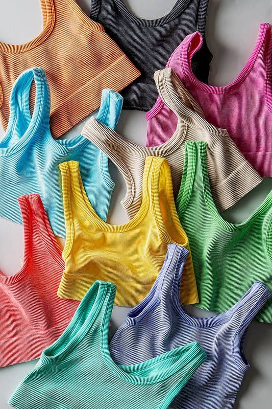 This sleeveless crop tank top features a scoop neckline at the front and back, a ribbed texture, and a comfortable stretch fit. The mineral wash finish adds a trendy touch, making it perfect for layering with jeans, shorts, or activewear. Available in a variety of vibrant colors for versatile styling.