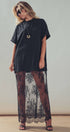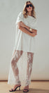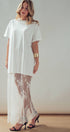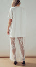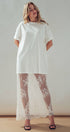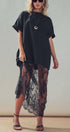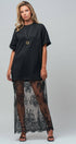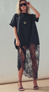 Make a bold statement with this edgy mixed-media dress. Combining a relaxed, oversized cotton t-shirt with a dramatic, sheer lace maxi skirt, this unique piece offers a striking contrast of casual comfort and romantic elegance.