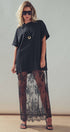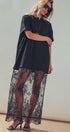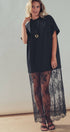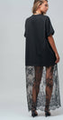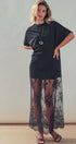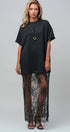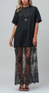 Design: Features a solid black t-shirt upper merging into a sheer, floor-length floral lace skirt.