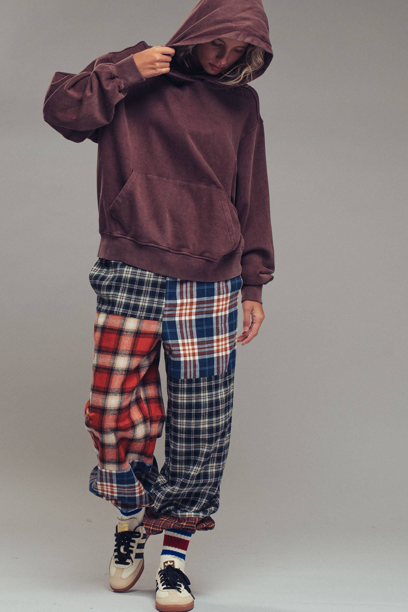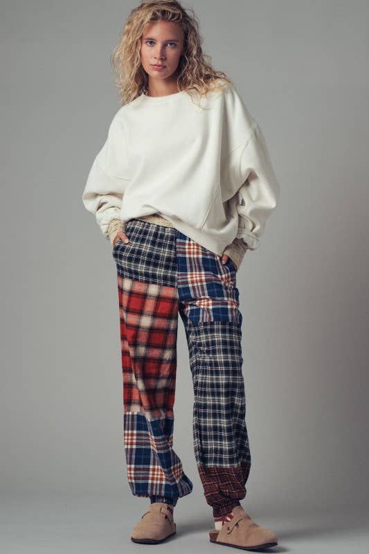 Add playful charm to your everyday style with these 100% cotton jogger pants featuring a bold patchwork of mixed plaid prints. Designed with an elastic waist and cuffs for effortless fit and comfort—perfect for fall lounging or casual outings.