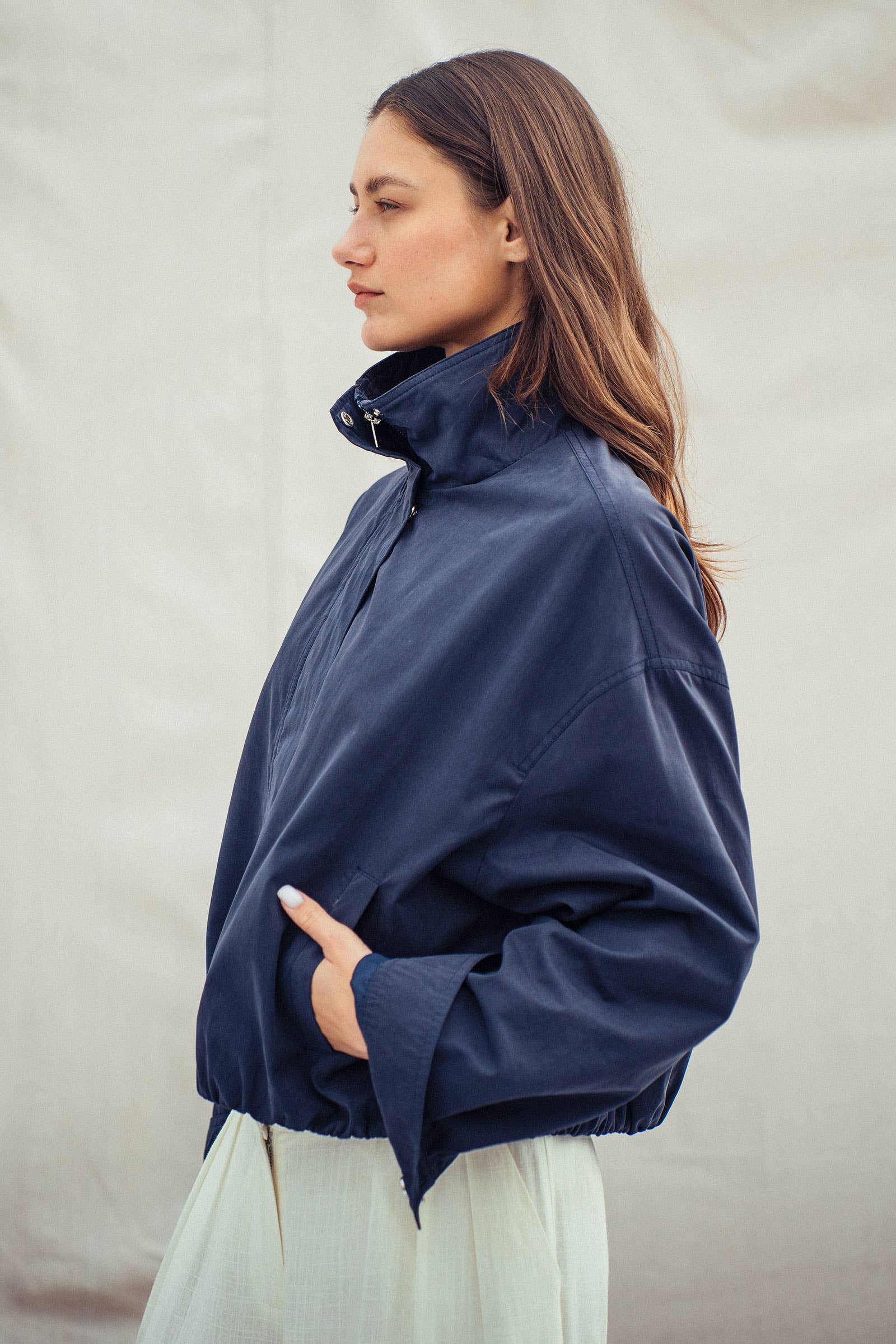 Elevate your spring 2025 wardrobe with this relaxed-fit zip jacket, crafted from a durable cotton-blend in a warm camel shade. Featuring a high stand collar, snap placket, elasticized hem and cuffs, and functional side pockets, this piece delivers a tailored yet effortless look for layering.