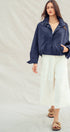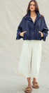 The jacket measures approximately 25" across the bust and 23" in length when laid flat (measured on size Small)