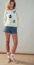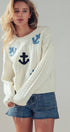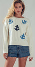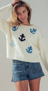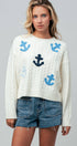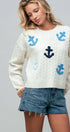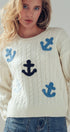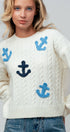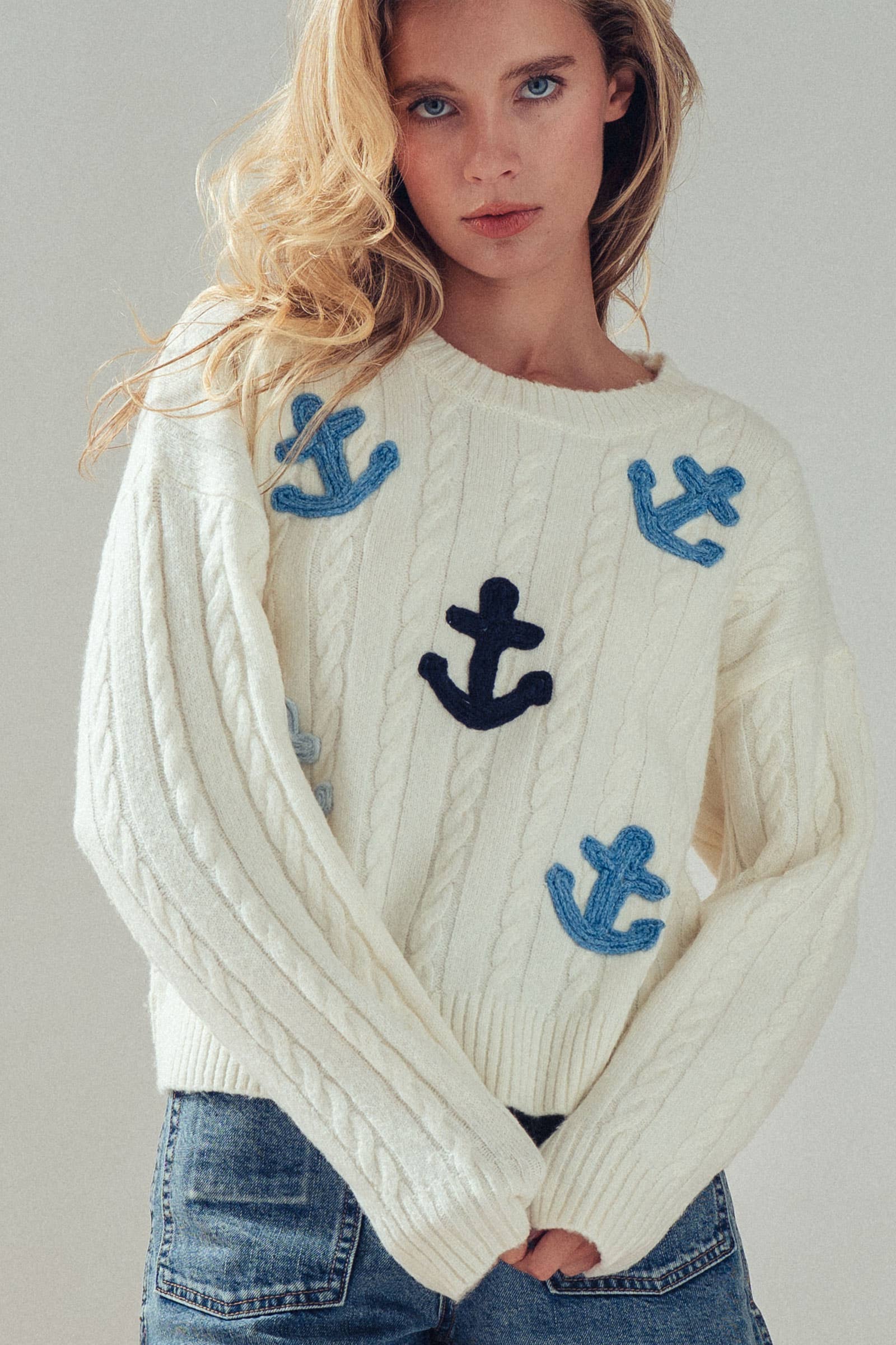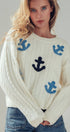 Sail into style with this charming cable knit sweater. Featuring soft, textured anchor appliques in contrasting blues, this cozy pullover brings a touch of nautical flair to your everyday wardrobe. It is the perfect layer for breezy coastal days or casual outings.