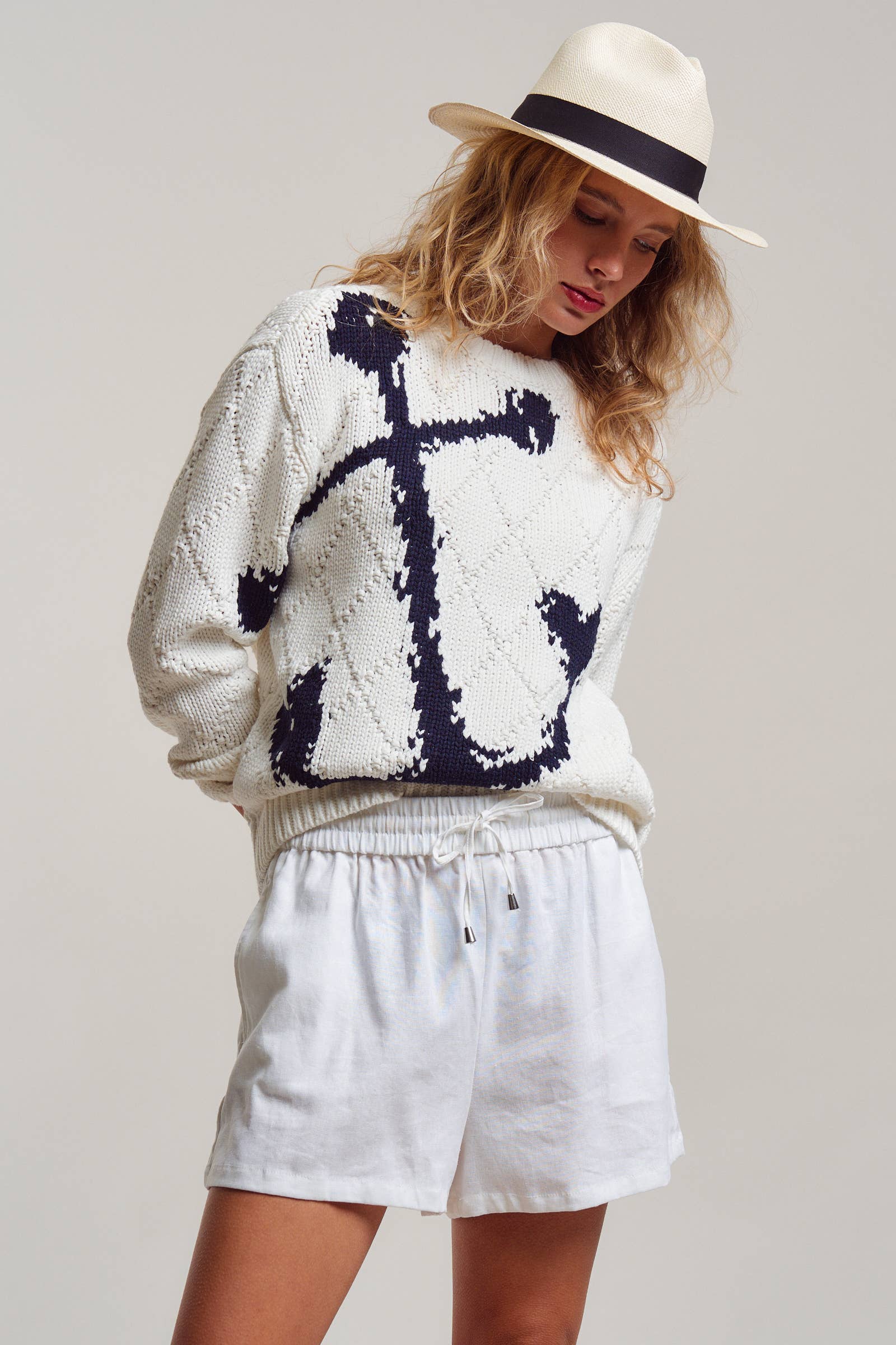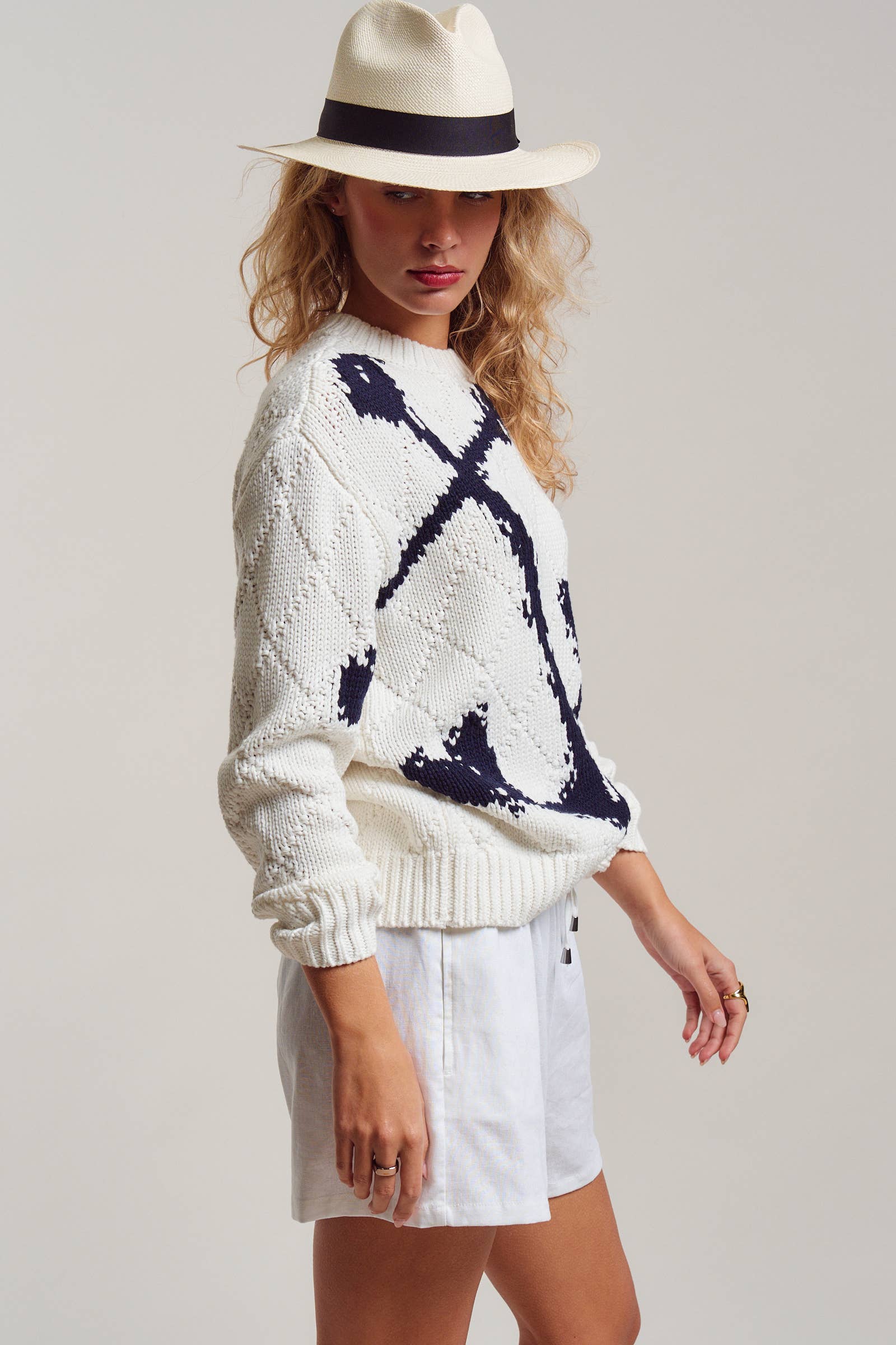 Wrap yourself in coastal charm with this cozy intarsia knit sweater. Featuring a bold, oversized navy anchor knit directly into the fabric, this cream pullover is elevated by an all-over textured diamond stitch. It’s the ultimate layer for breezy boat rides, beach bonfires, or cooler spring mornings.