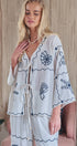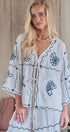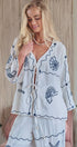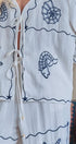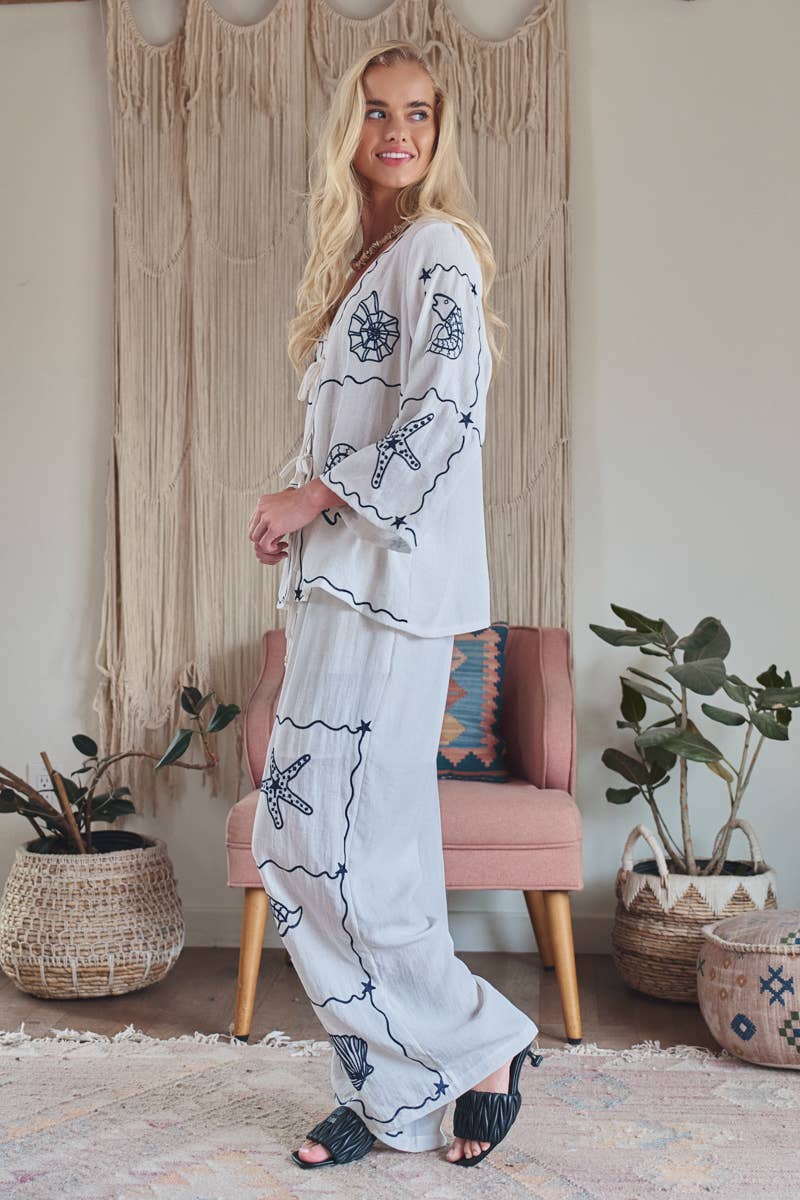 Embrace a coastal aesthetic with this breezy tie-front top. The design features whimsical navy blue embroidery depicting seashells, starfish, and fish against a crisp white textured backdrop, making it the ultimate resort-wear piece.