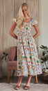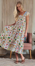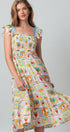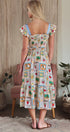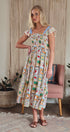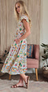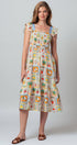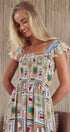 Embrace whimsical, vintage-inspired charm with this novelty stamp print midi dress. The bodice is beautifully shaped by all-over smocking, complemented by sweet ruffle cap sleeves. Its tiered, flowy skirt makes this dress a delightful and comfortable statement piece.