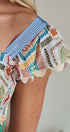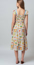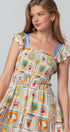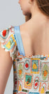 Design: Features a whimsical novelty print inspired by vintage fruit stamps, with a square neckline.
