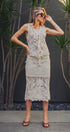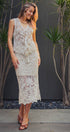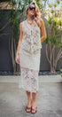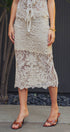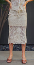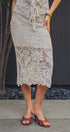 Channel a bohemian vacation aesthetic with this intricate crochet midi skirt. Featuring a detailed floral and geometric open-knit pattern in a creamy neutral tone, this skirt is designed with a comfortable drawstring waist and a partial mini-length lining that highlights the sheer, scalloped hem.