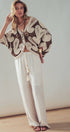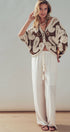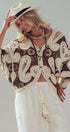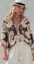 Design: Contrast brown and beige paisley motifs with button front