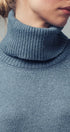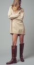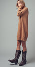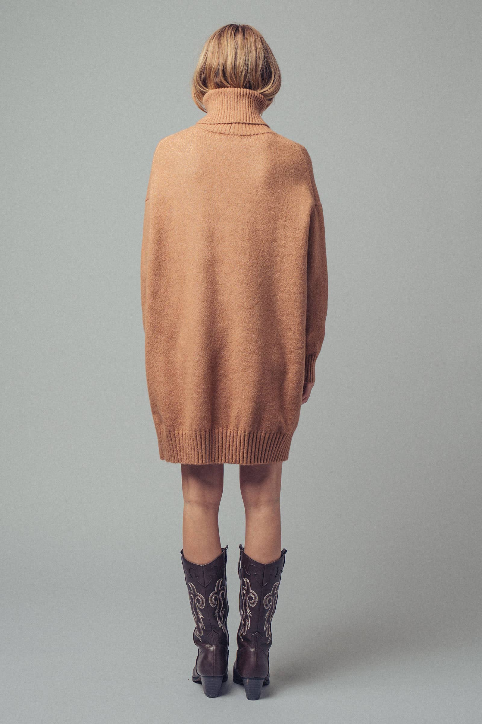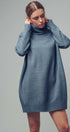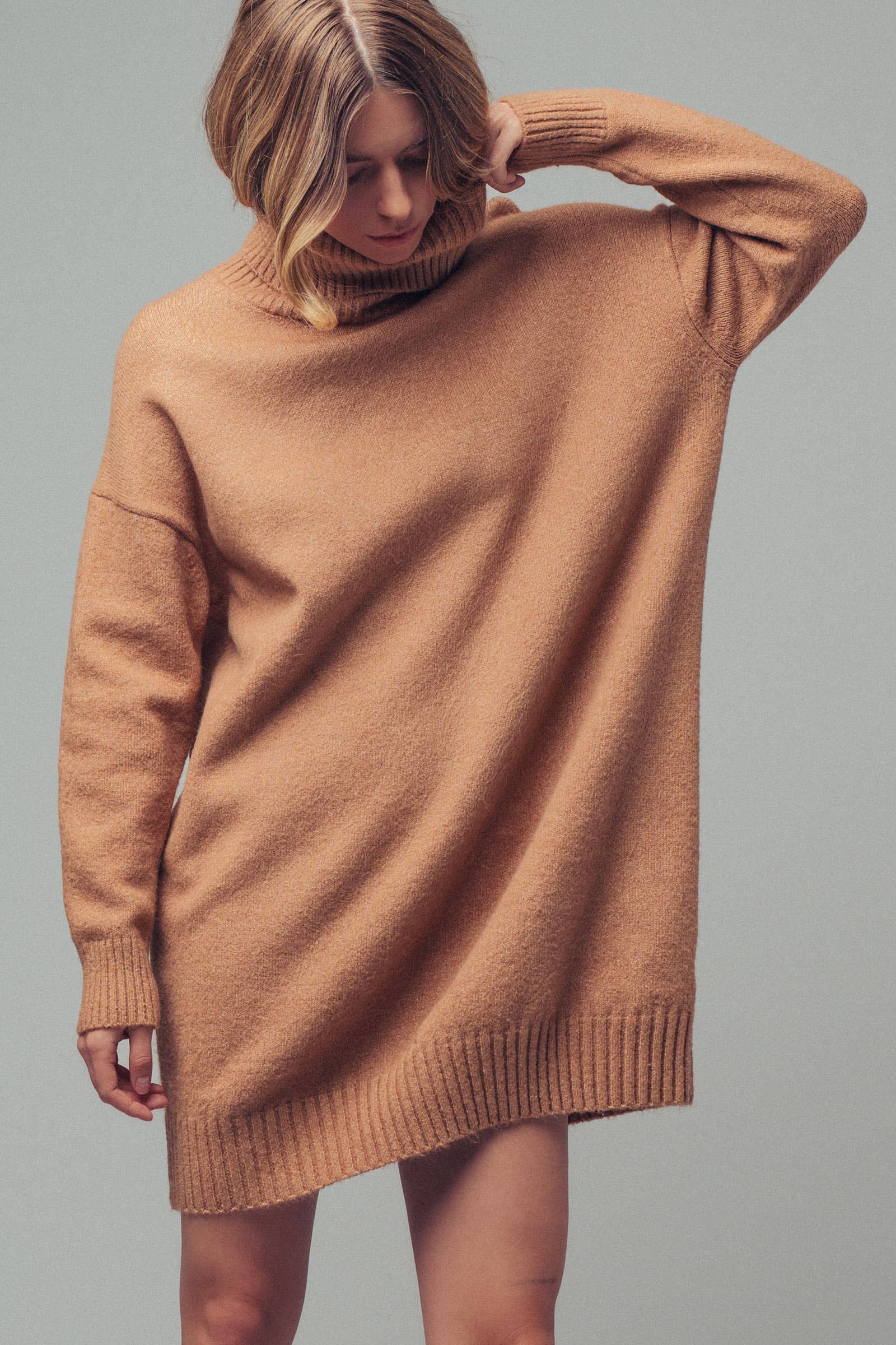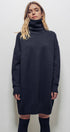 Design: A classic sweater dress silhouette with a chunky ribbed turtleneck, cuffs, and hem.