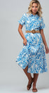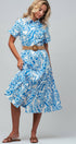Design: All-over blue paisley print with a tiered skirt