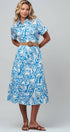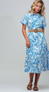Update your store's collection with this vibrant shirt dress, featuring an intricate blue and white paisley print on breathable cotton. The classic button-down silhouette is elevated by a tiered midi skirt and a woven belt that defines the waist, offering a versatile polished look for any occasion.