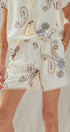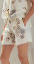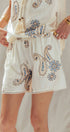 Curate a bohemian aesthetic with these textured linen blend shorts, featuring elaborate paisley embroidery in earthy tones. Designed for a comfortable fit, the silhouette is highlighted by a playful mini pom-pom trim along the hemline, adding a unique artisanal touch to the classic cut.