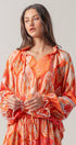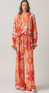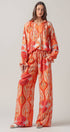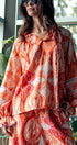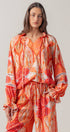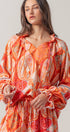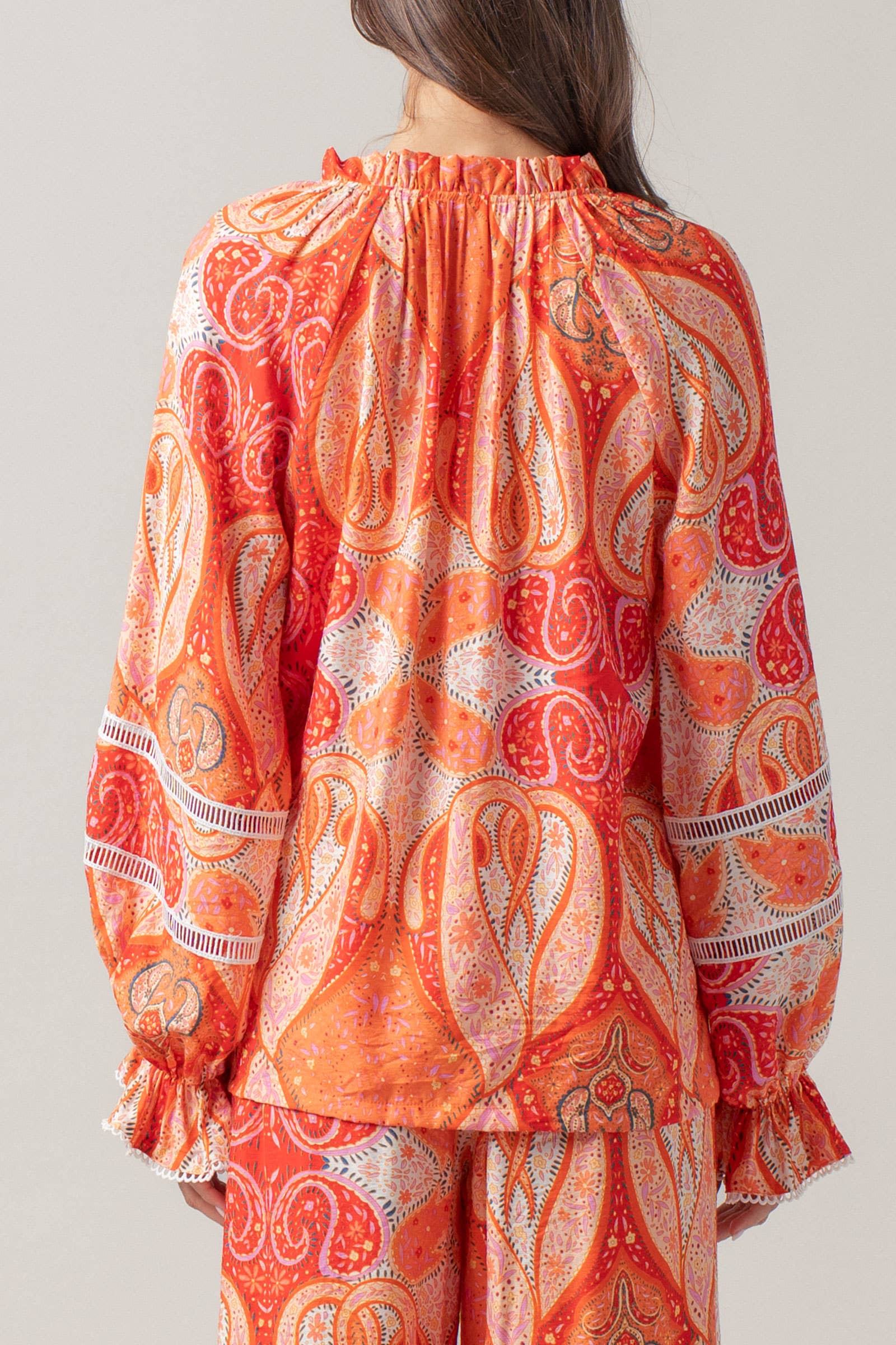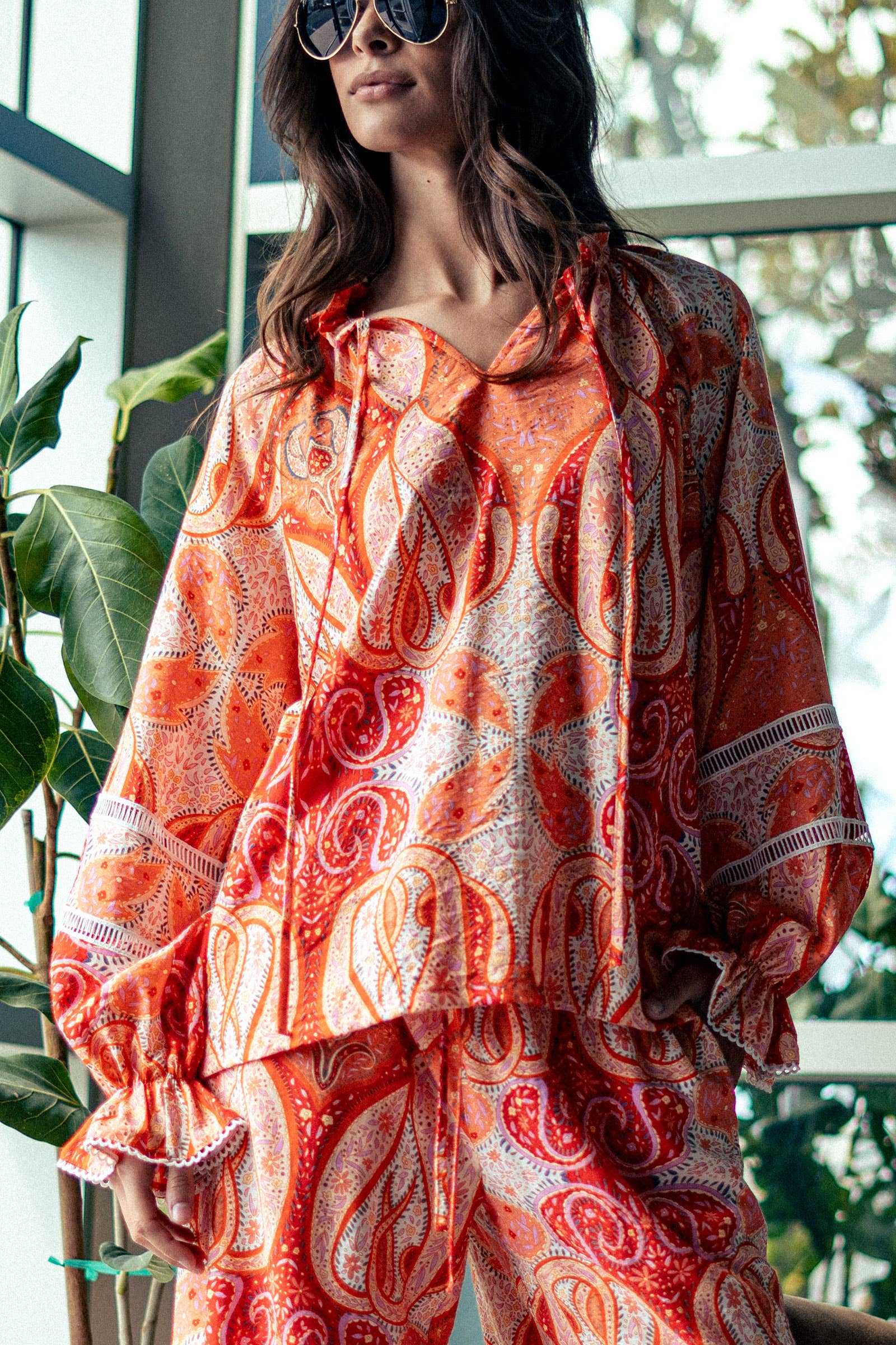 This vibrant paisley print blouse features a tie-neck detail and dramatic bell sleeves with lace accents for a bohemian-inspired look. Crafted from a lightweight viscose blend, it offers a relaxed fit perfect for spring and summer styling.