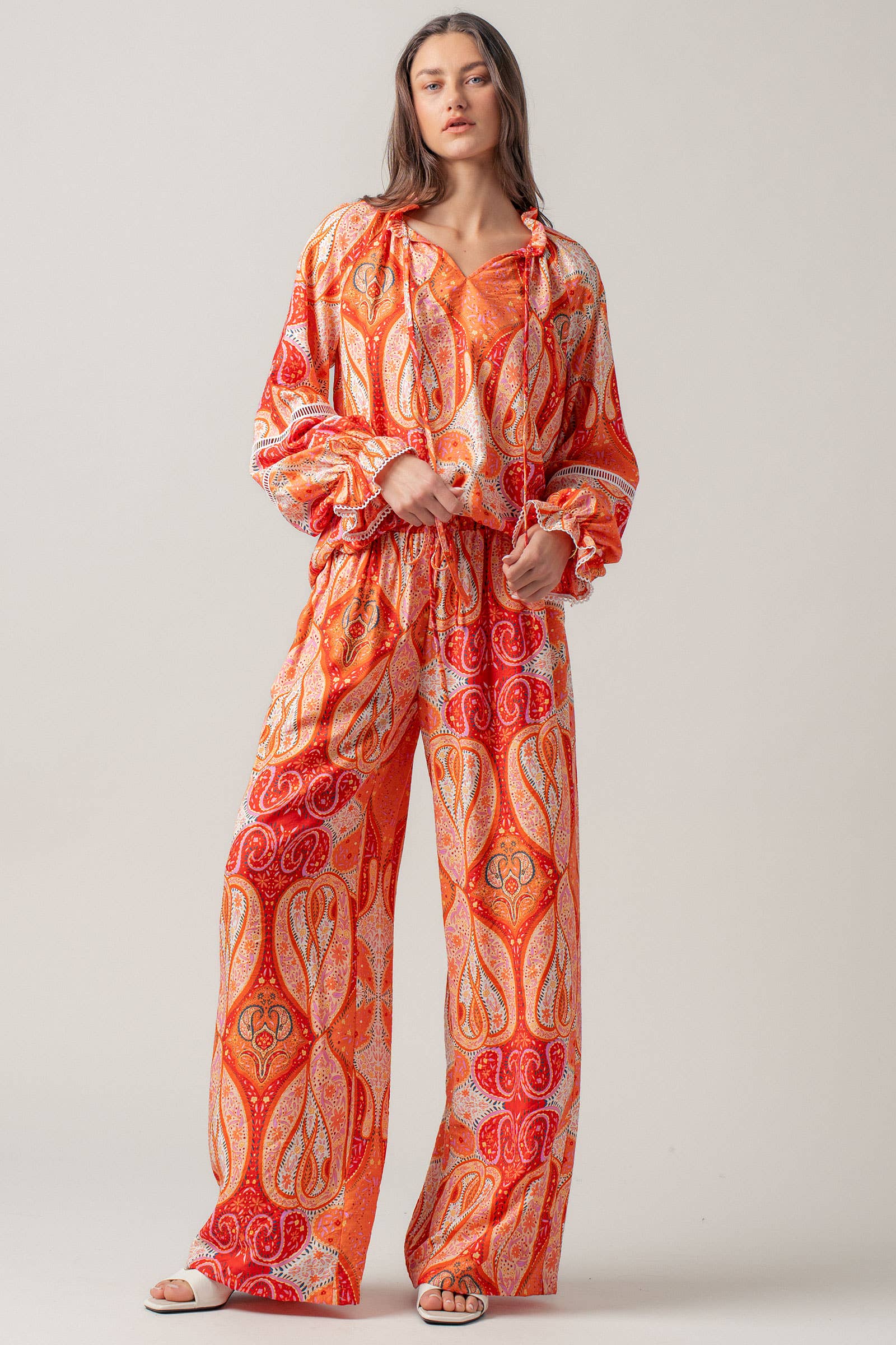Paisley Print Tie-Neck Blouse with Bell Sleeves
