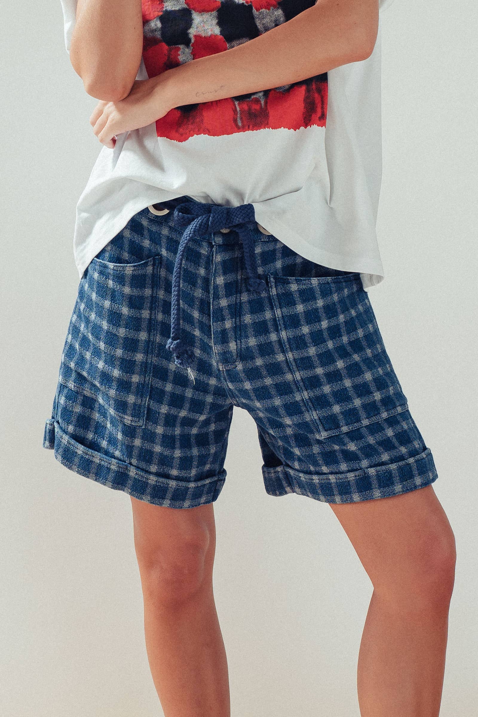 Design & Details: Defined by a classic blue and white plaid check pattern. The waist features a thick, nautical-inspired navy rope drawstring with knotted ends for a secure, adjustable fit.