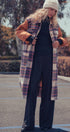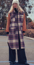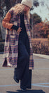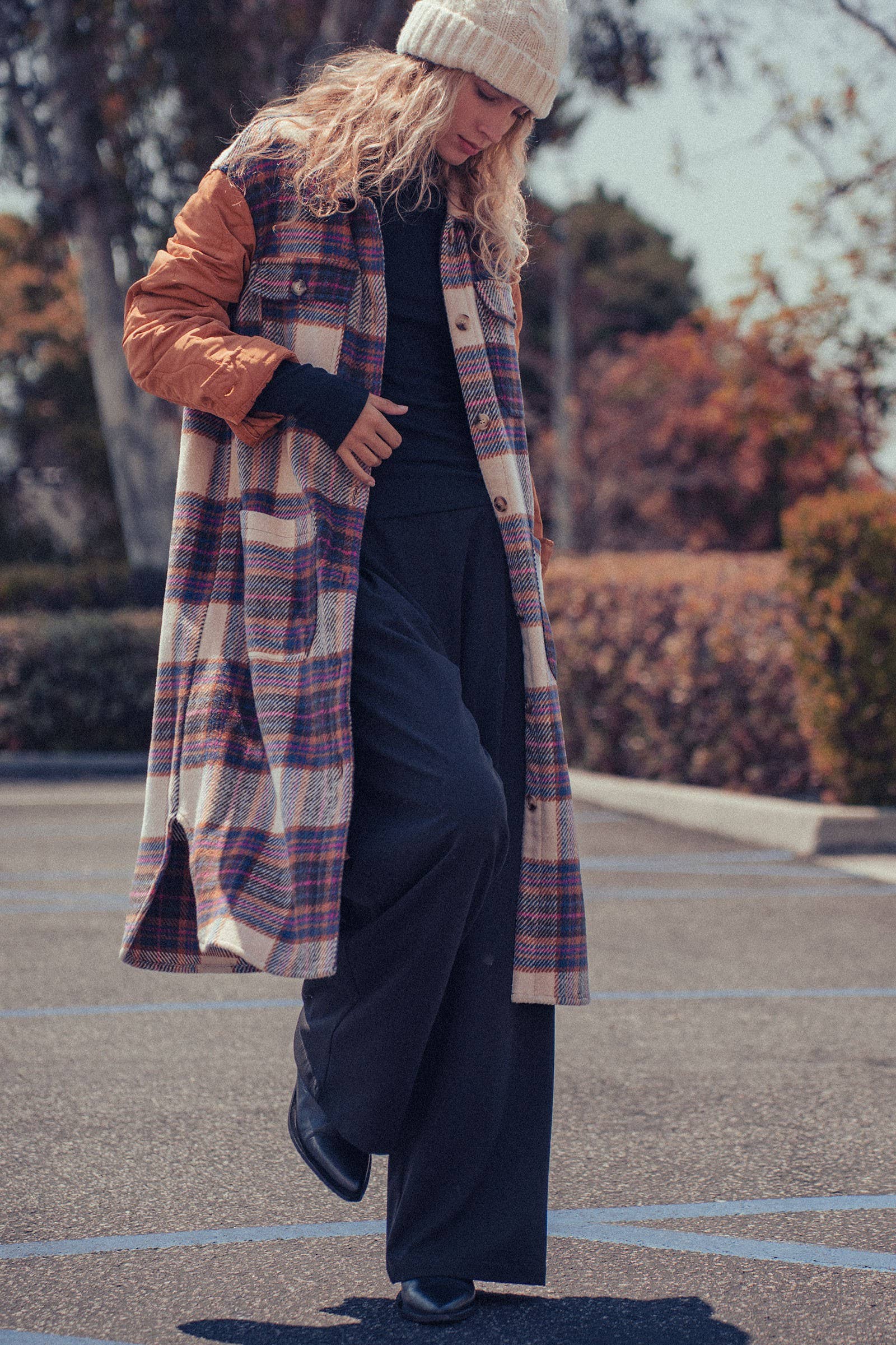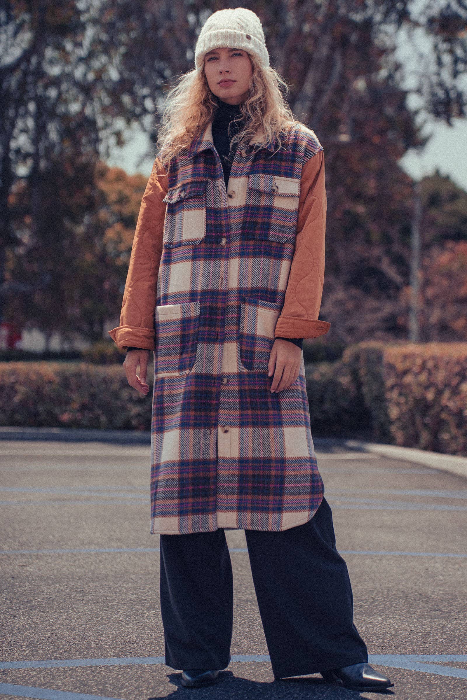 Bold and heritage-inspired, this longline coat combines plaid wool-blend panels with quilted sleeves for a mix of cozy textures. Featuring flap and patch pockets, a button-down closure, and a curved hemline, it reimagines a classic with modern edge. Oversized and effortless, it’s perfect for layering through transitional weather.