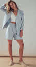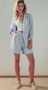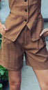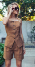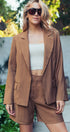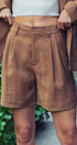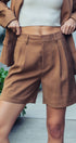 These tailored shorts feature chic front pleats, offering a sophisticated alternative to denim jeans. Styled with the matching blazer or a simple tank, they create a polished, breezy look perfect for modern western apparel collections.