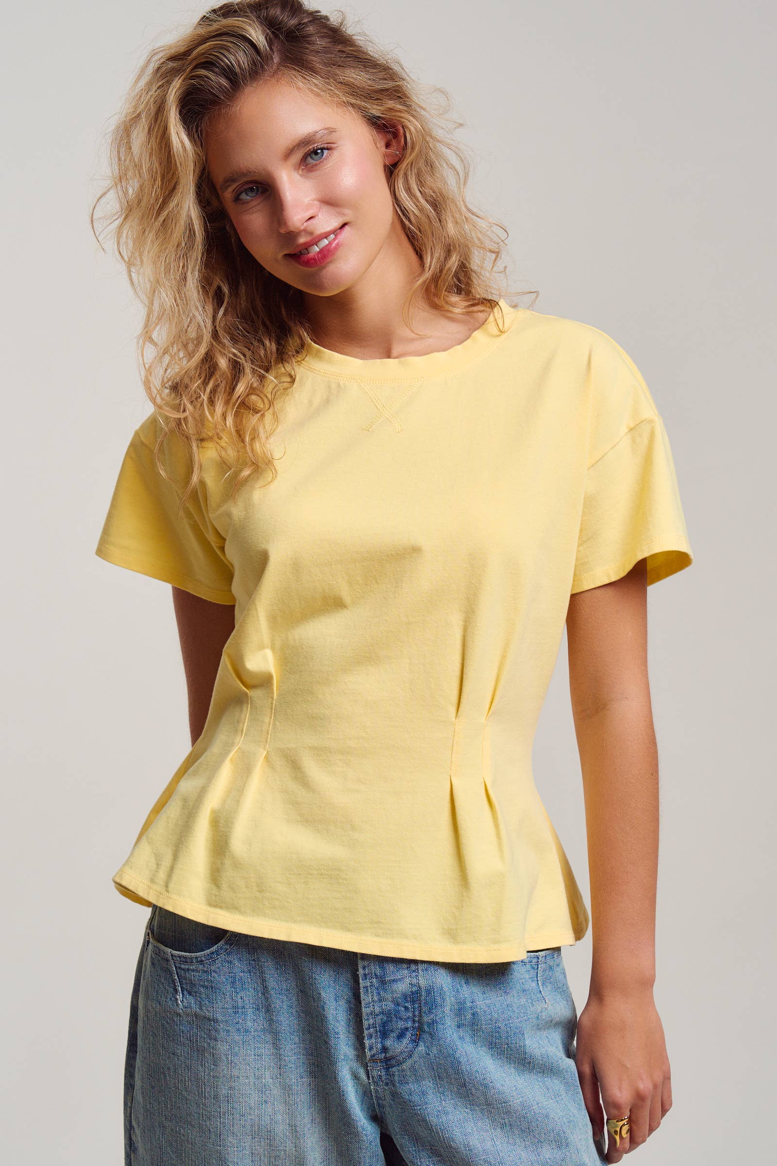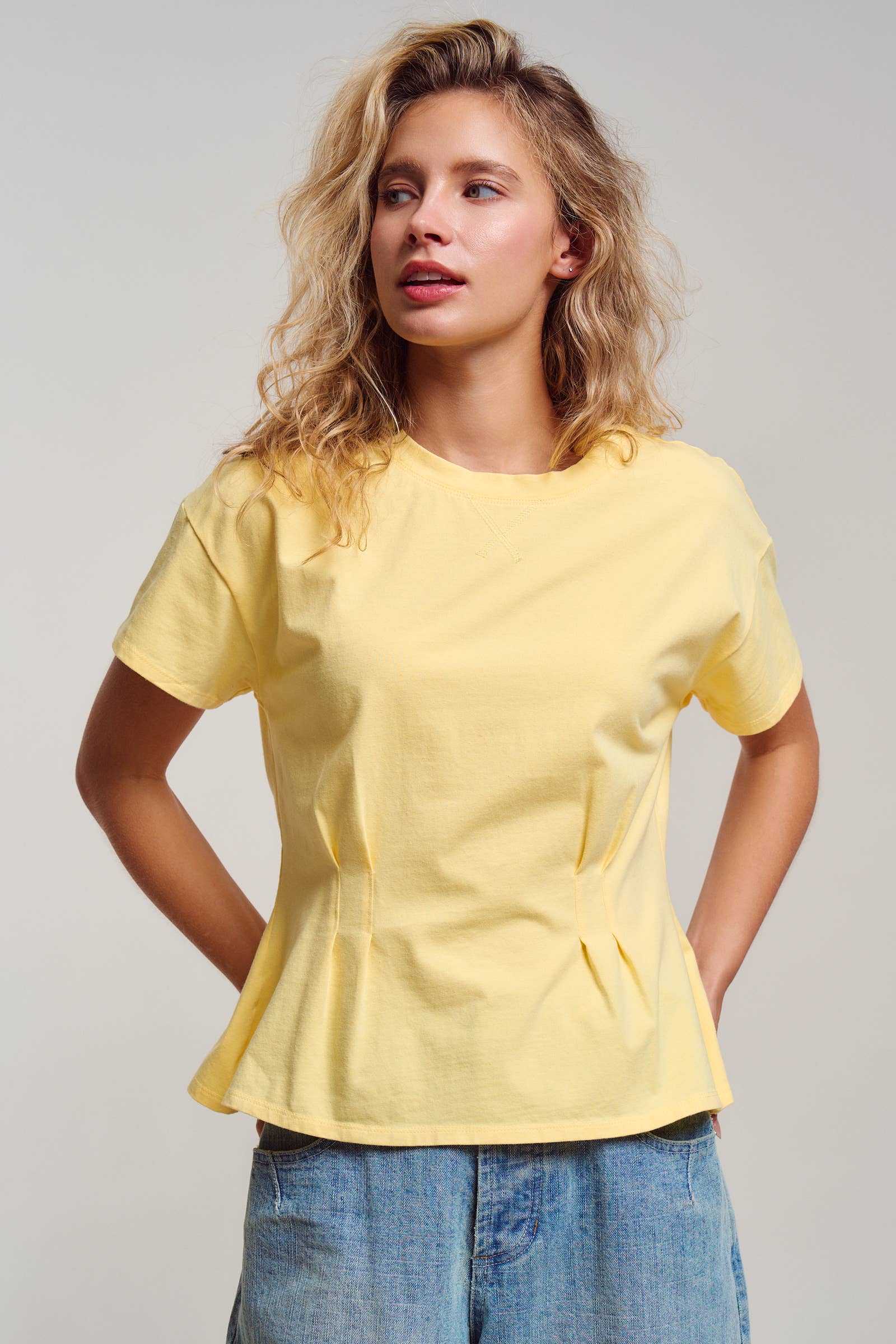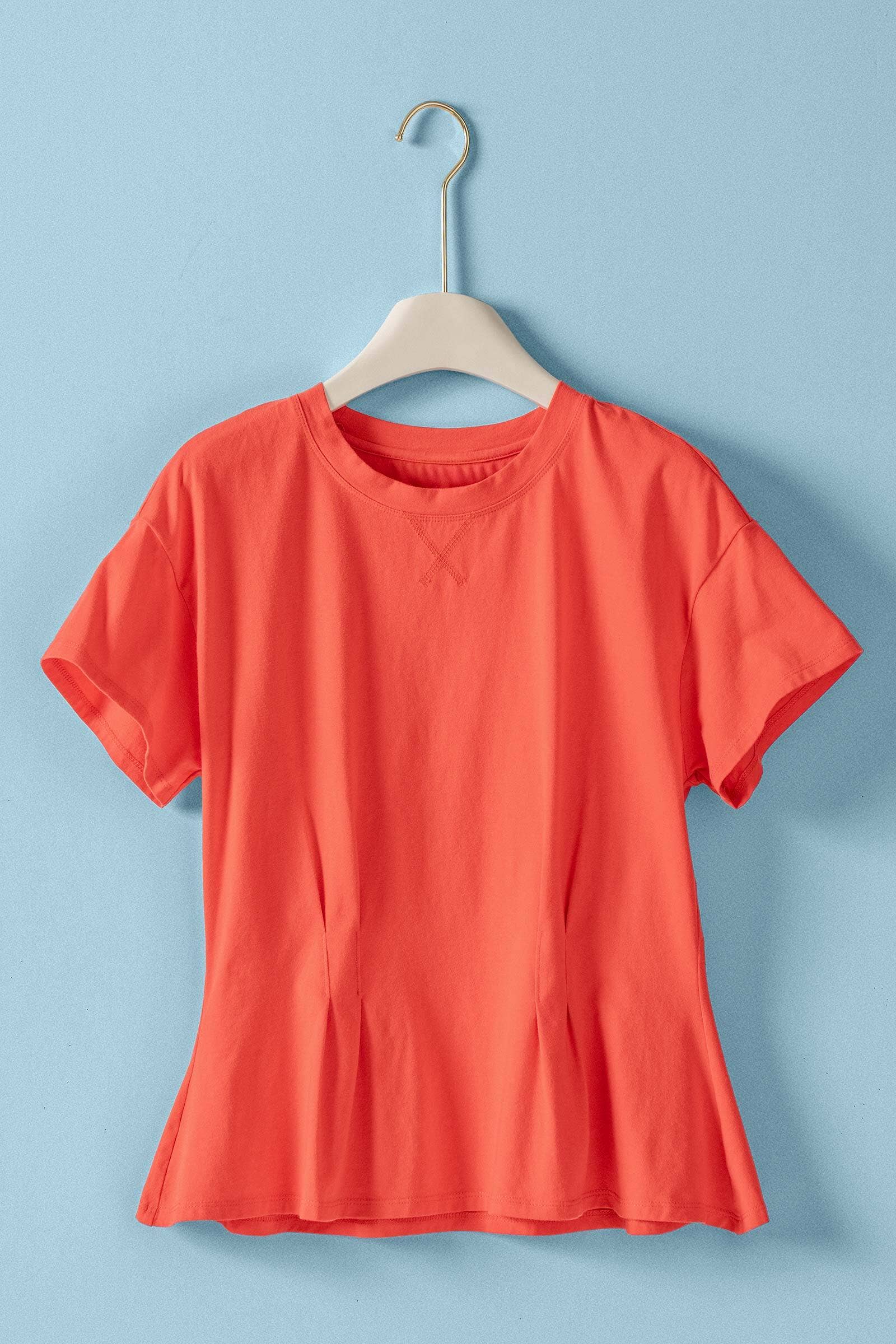 Upgrade your basics collection with this figure-flattering cotton tee. Unlike standard boxy t-shirts, this top features clever vertical waist pleats that nip in the silhouette before releasing into a subtle flare, creating an instant hourglass shape. Finished with a sporty V-stitch at the neckline, it’s the perfect blend of comfort and style.