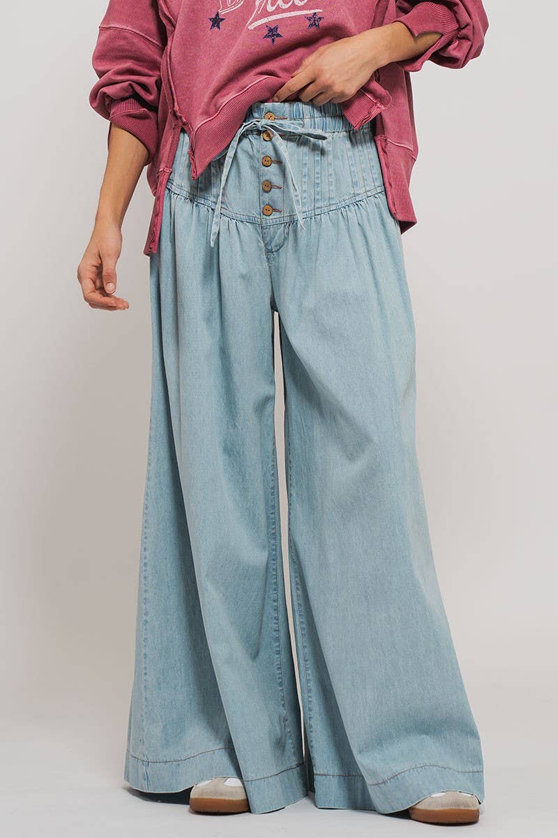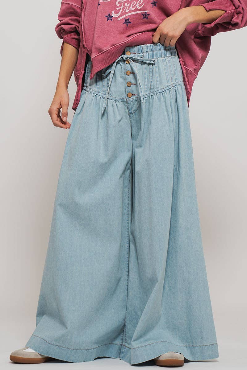 These lightweight wide-leg pants feature a pleated design with button and drawstring closure for a comfortable fit. Perfect for casual outings, they combine style and functionality with their relaxed silhouette.
