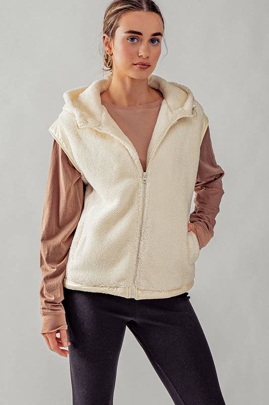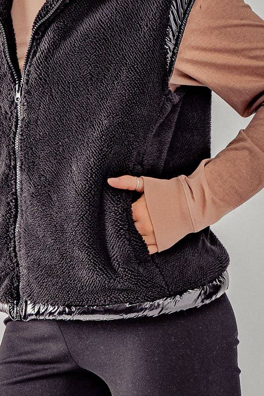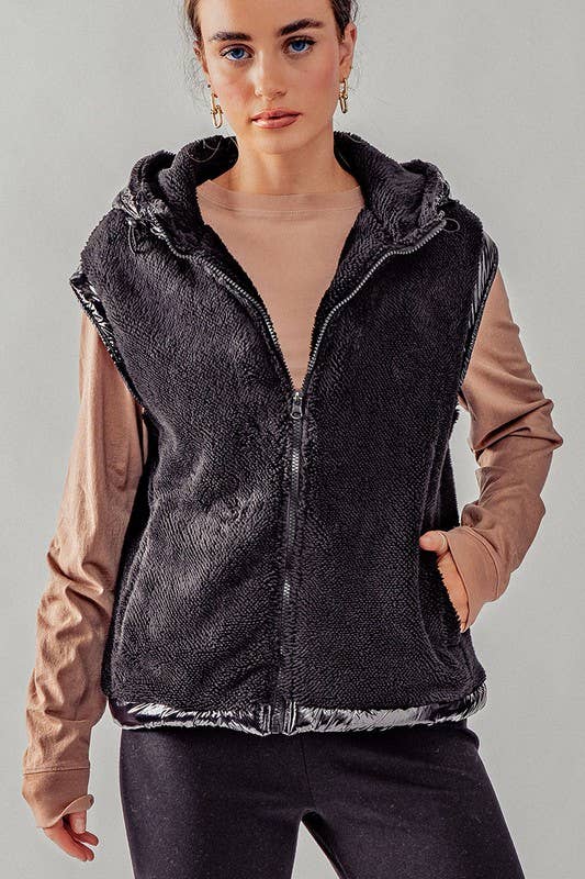 Plush Faux Fur Zip Up with Contrast Trim Hooded Vest