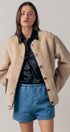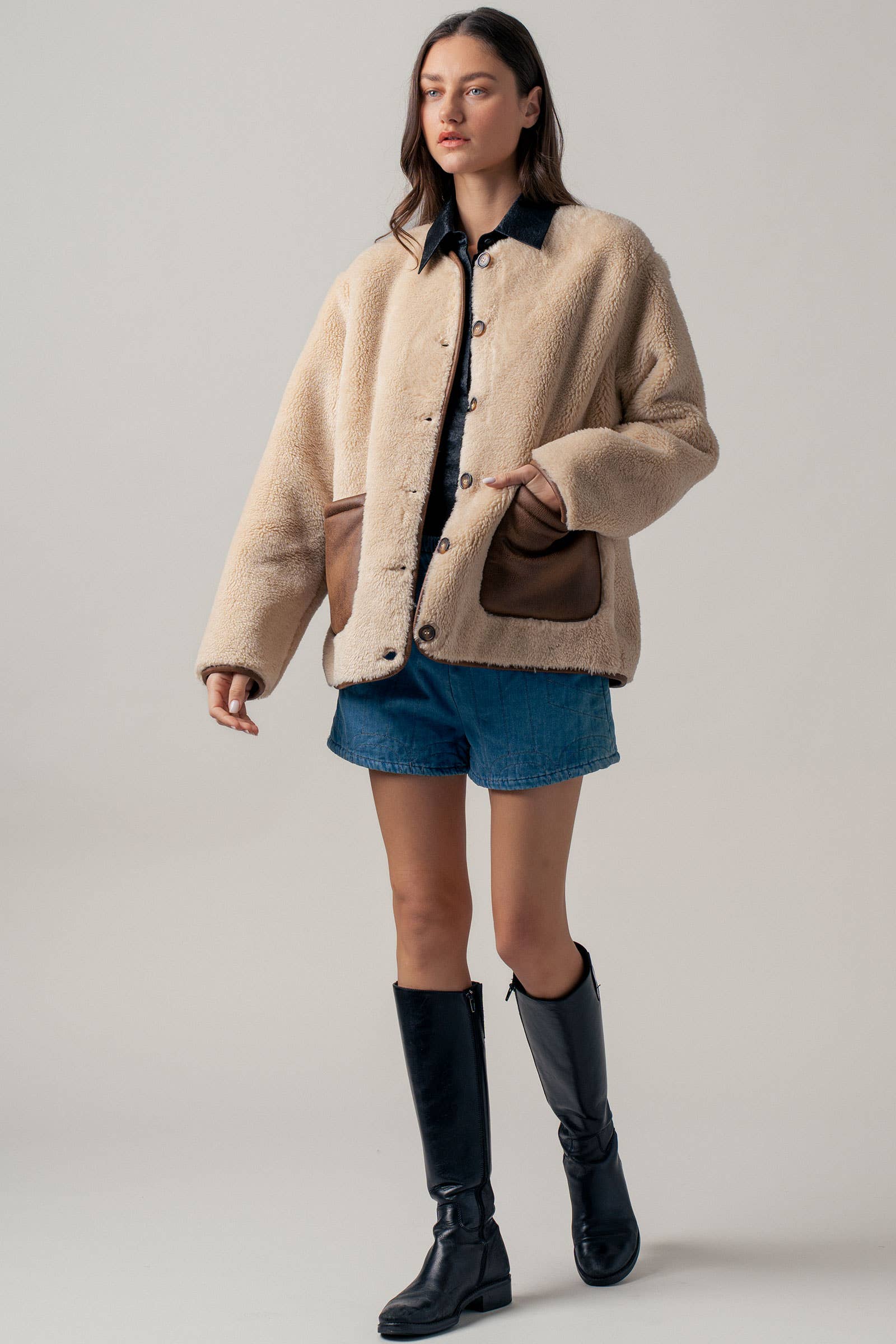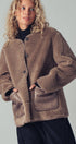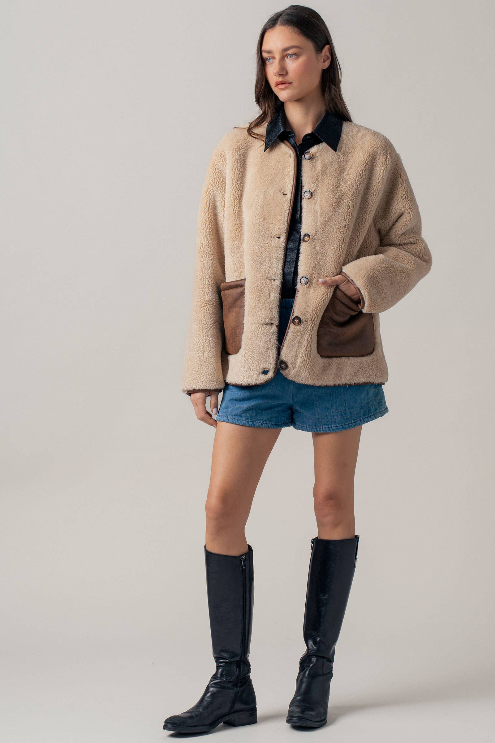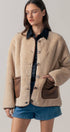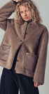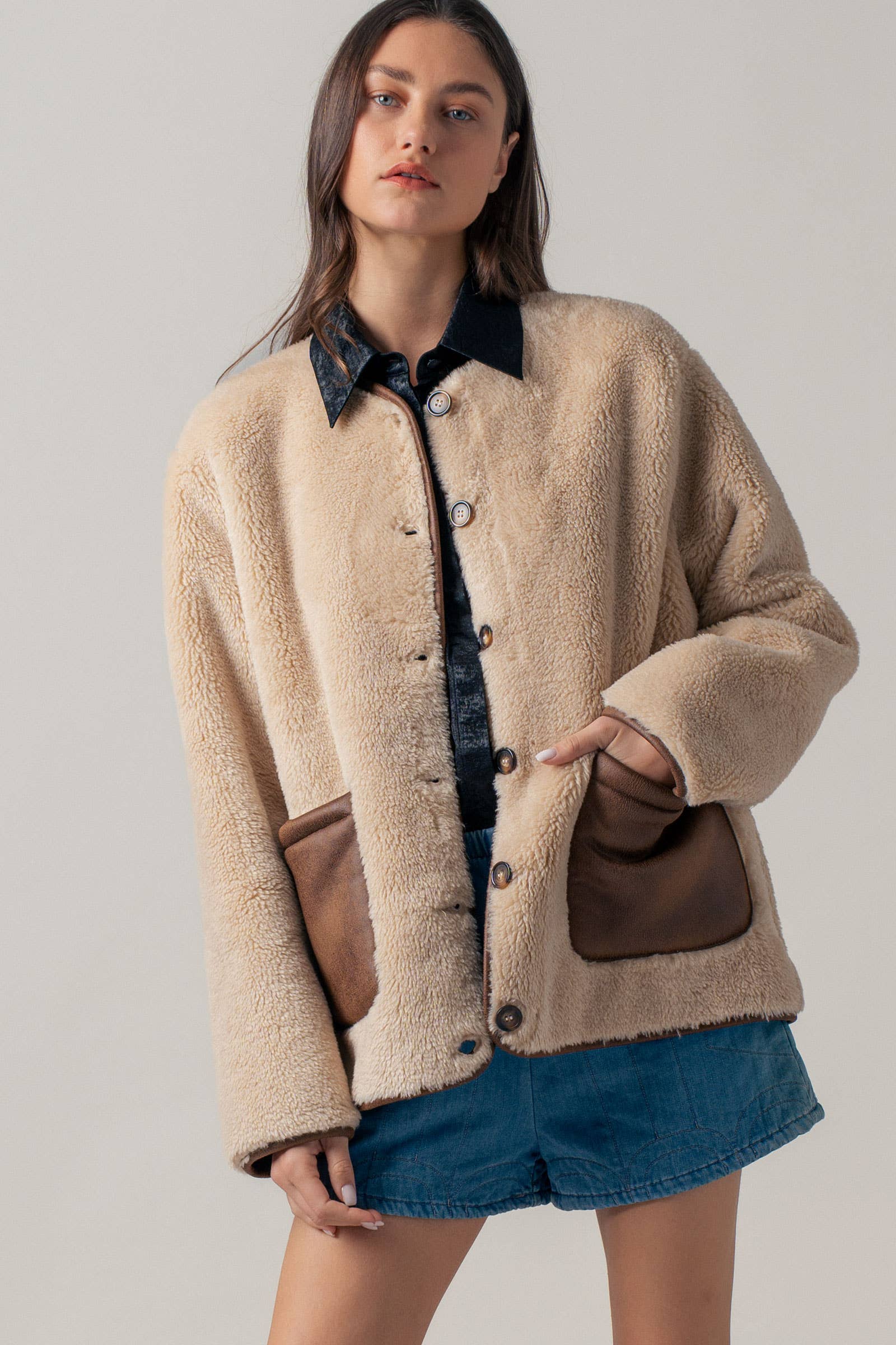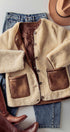 Wrap up in cozy comfort with our plush faux shearling jacket, designed to keep style and warmth in perfect balance. Featuring smooth faux suede patch pockets for a touch of luxe contrast, this jacket combines casual ease with elevated details.