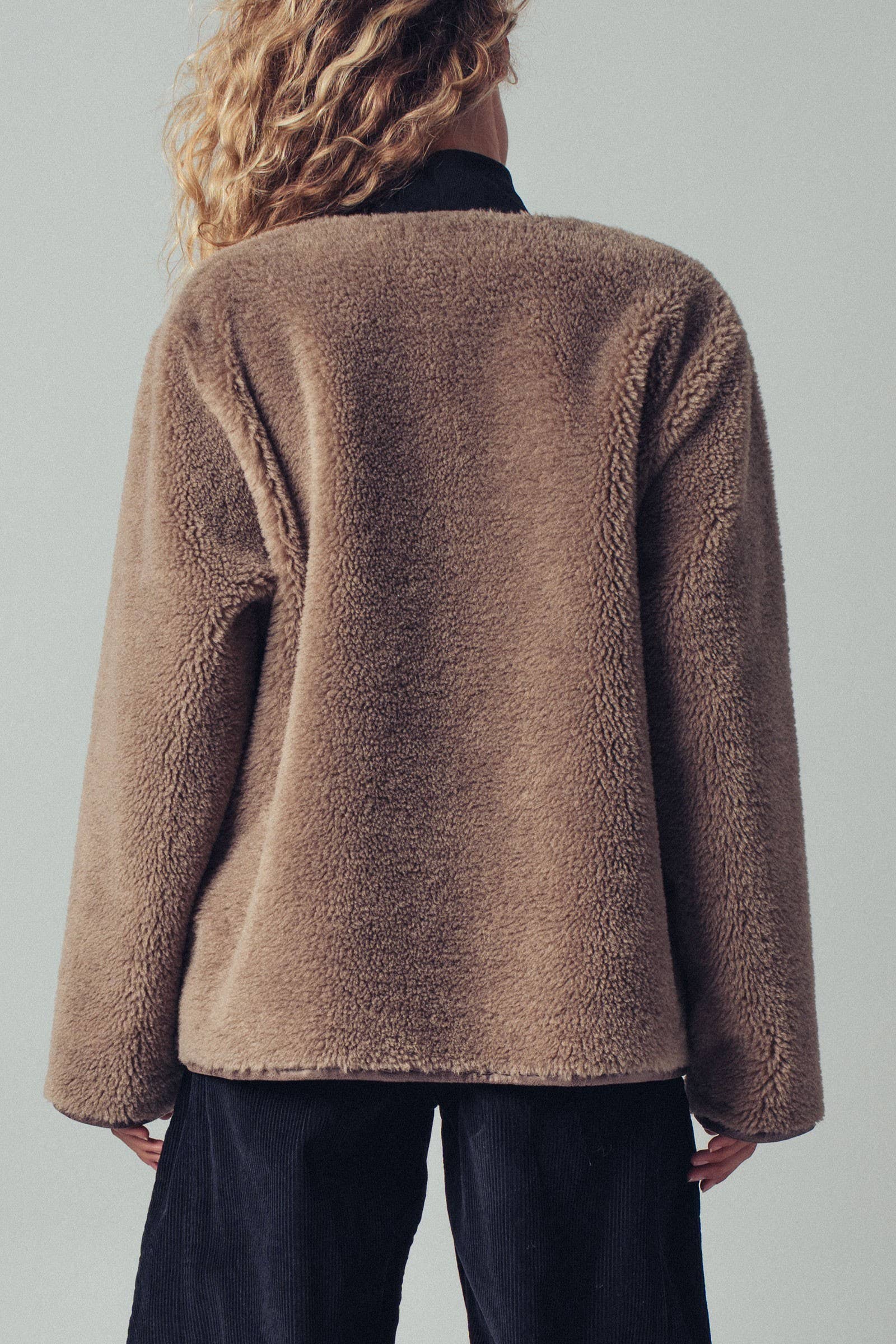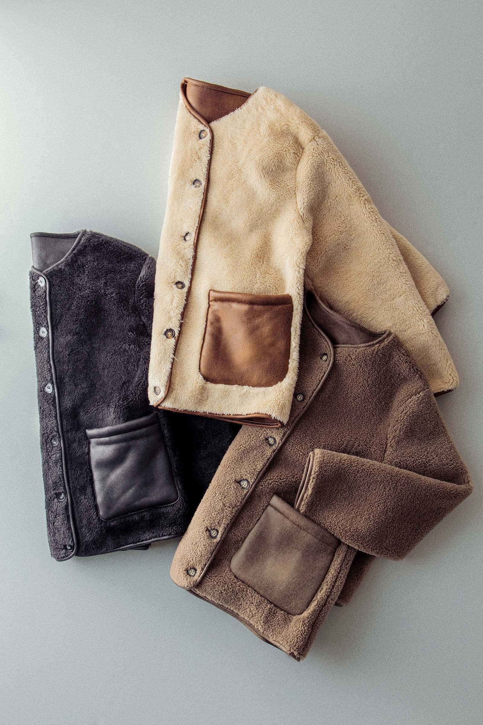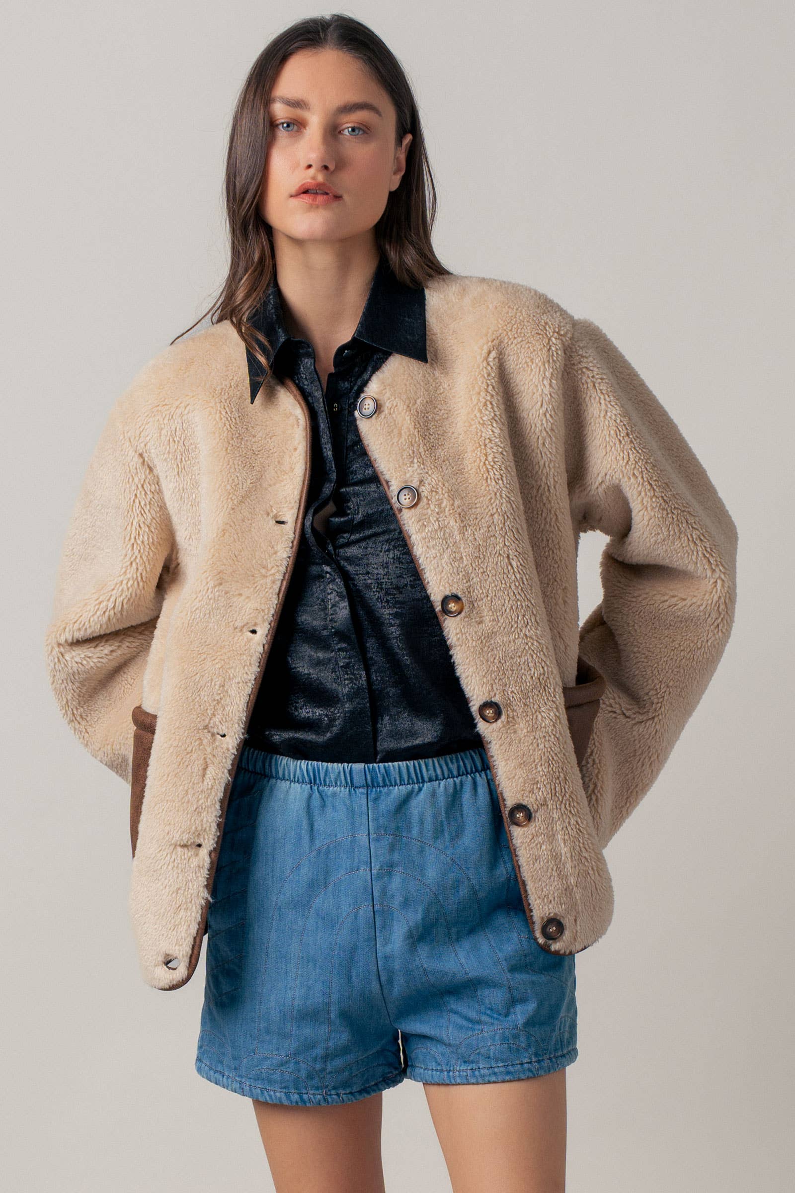 Design: Plush faux shearling body with a full button-front closure.