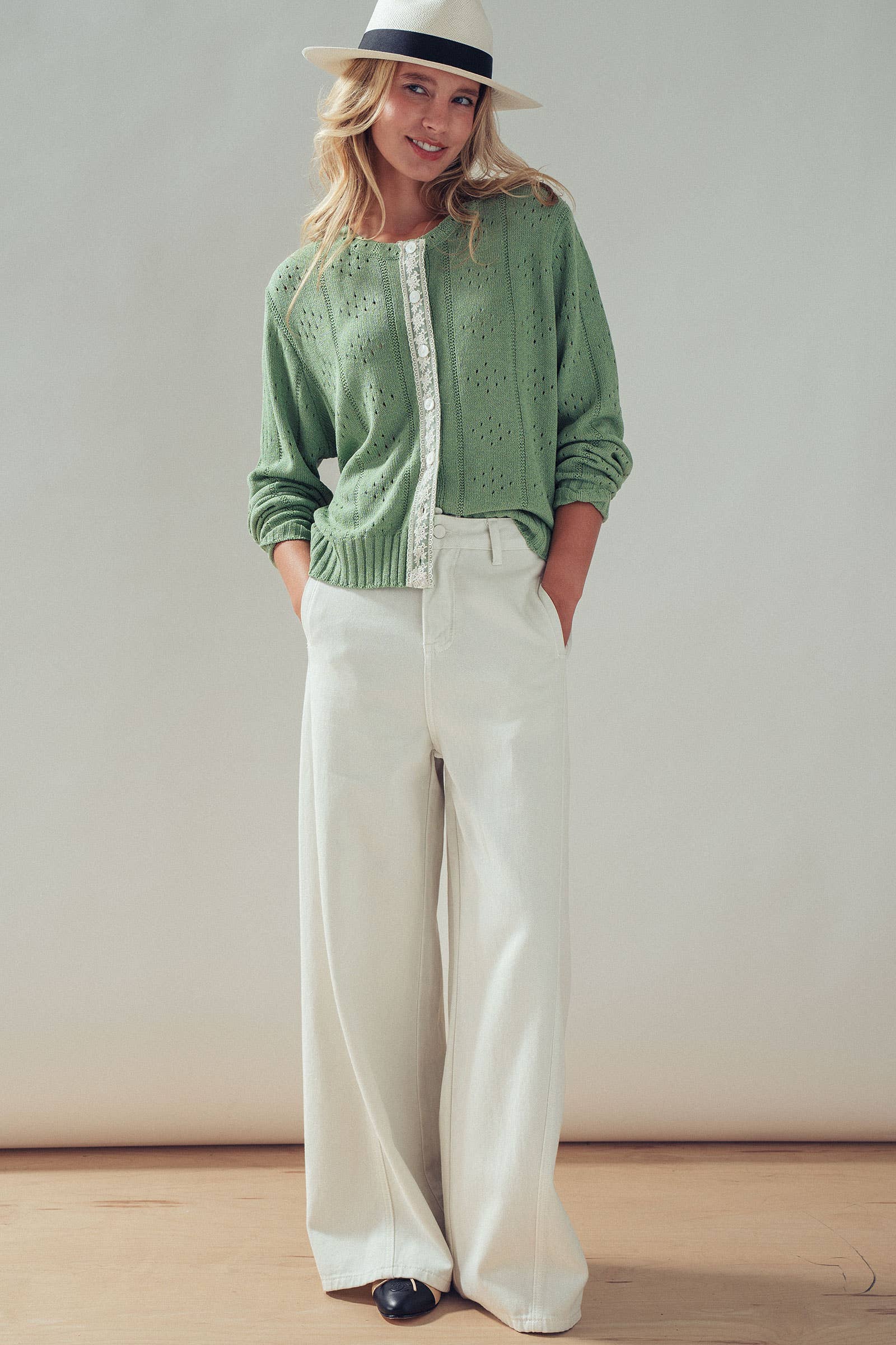 Pointelle Knit Cardigan Lace Trim Button Down