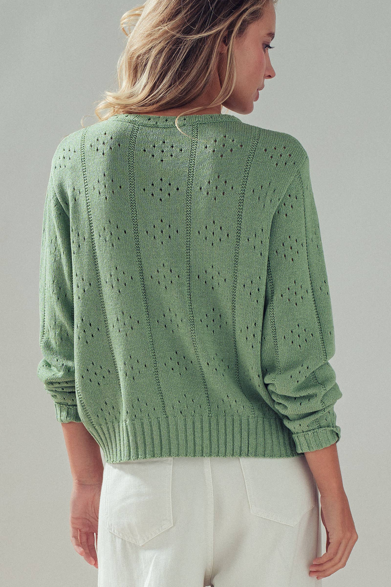Texture: Crafted with an all-over pointelle stitch pattern (small, decorative holes) that creates a lightweight and breathable feel.