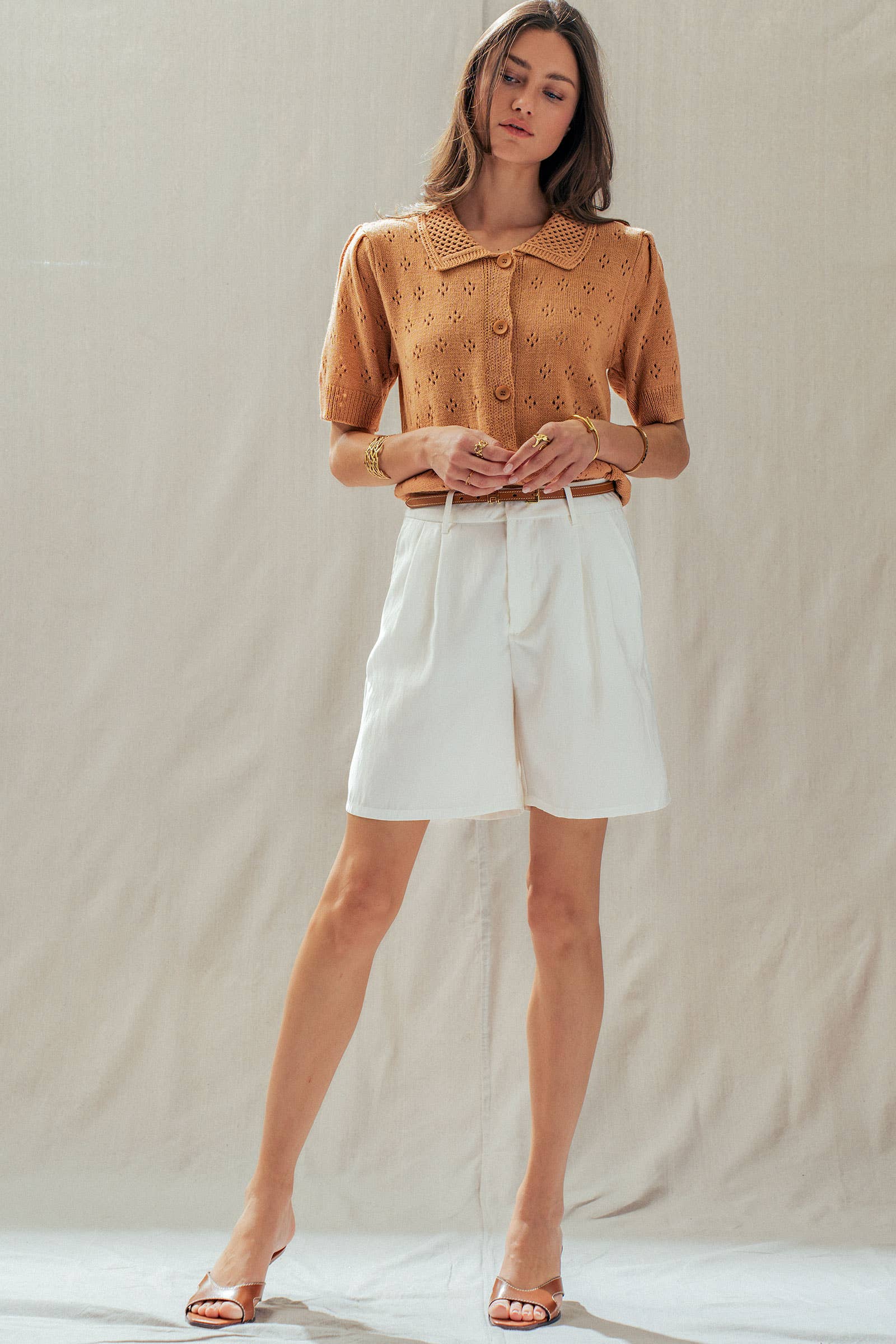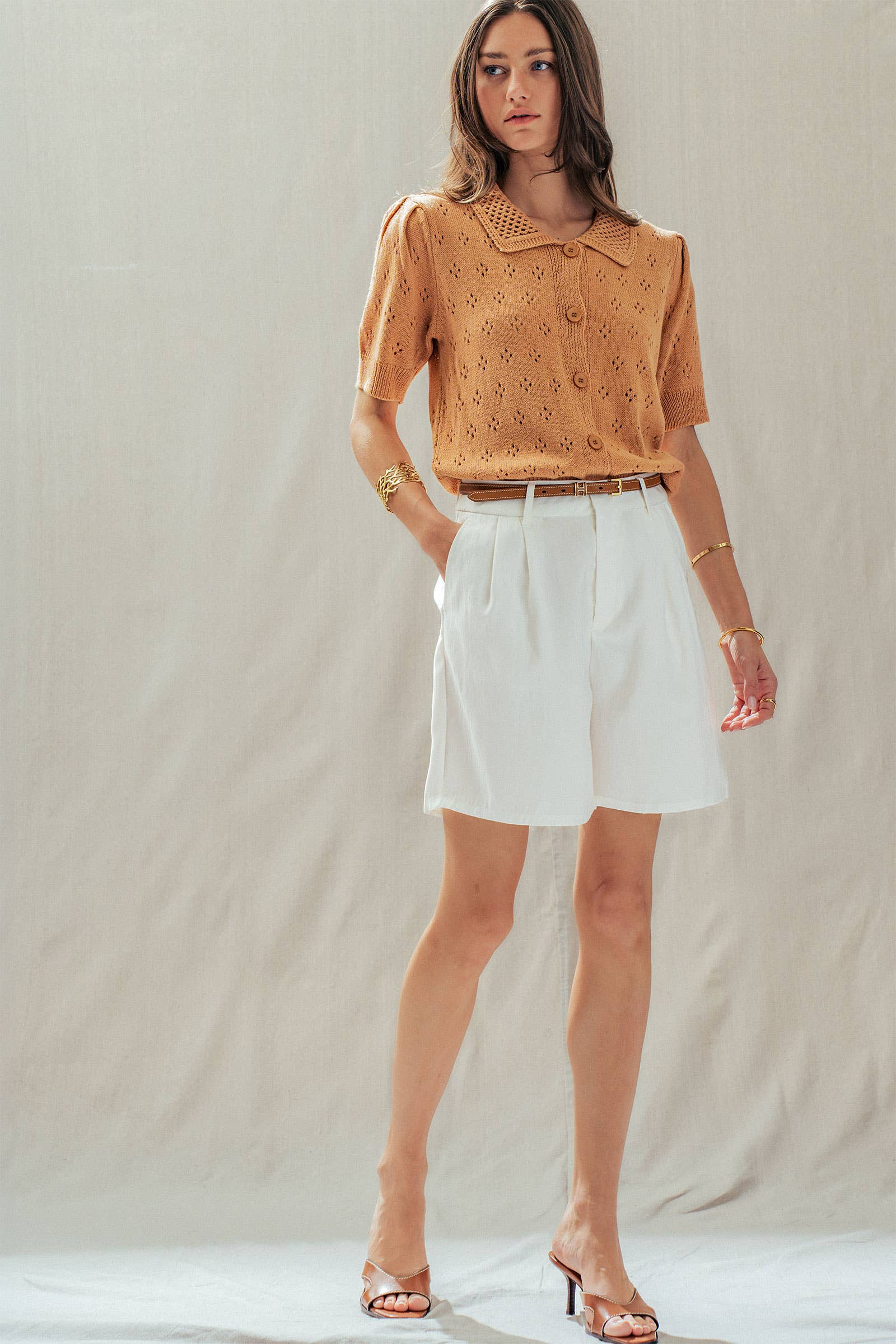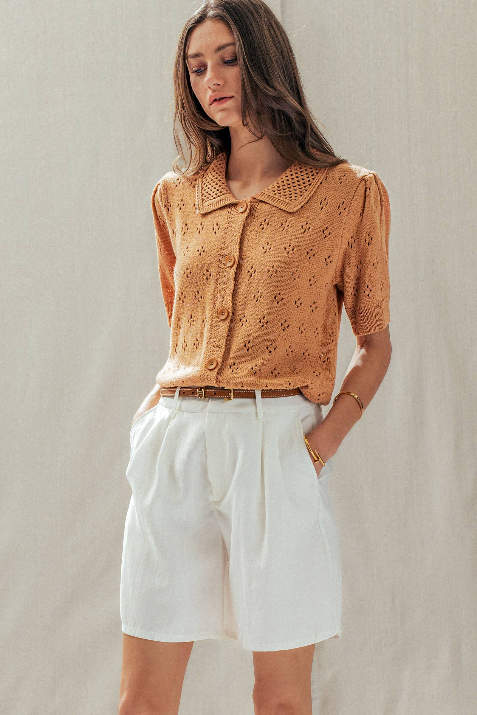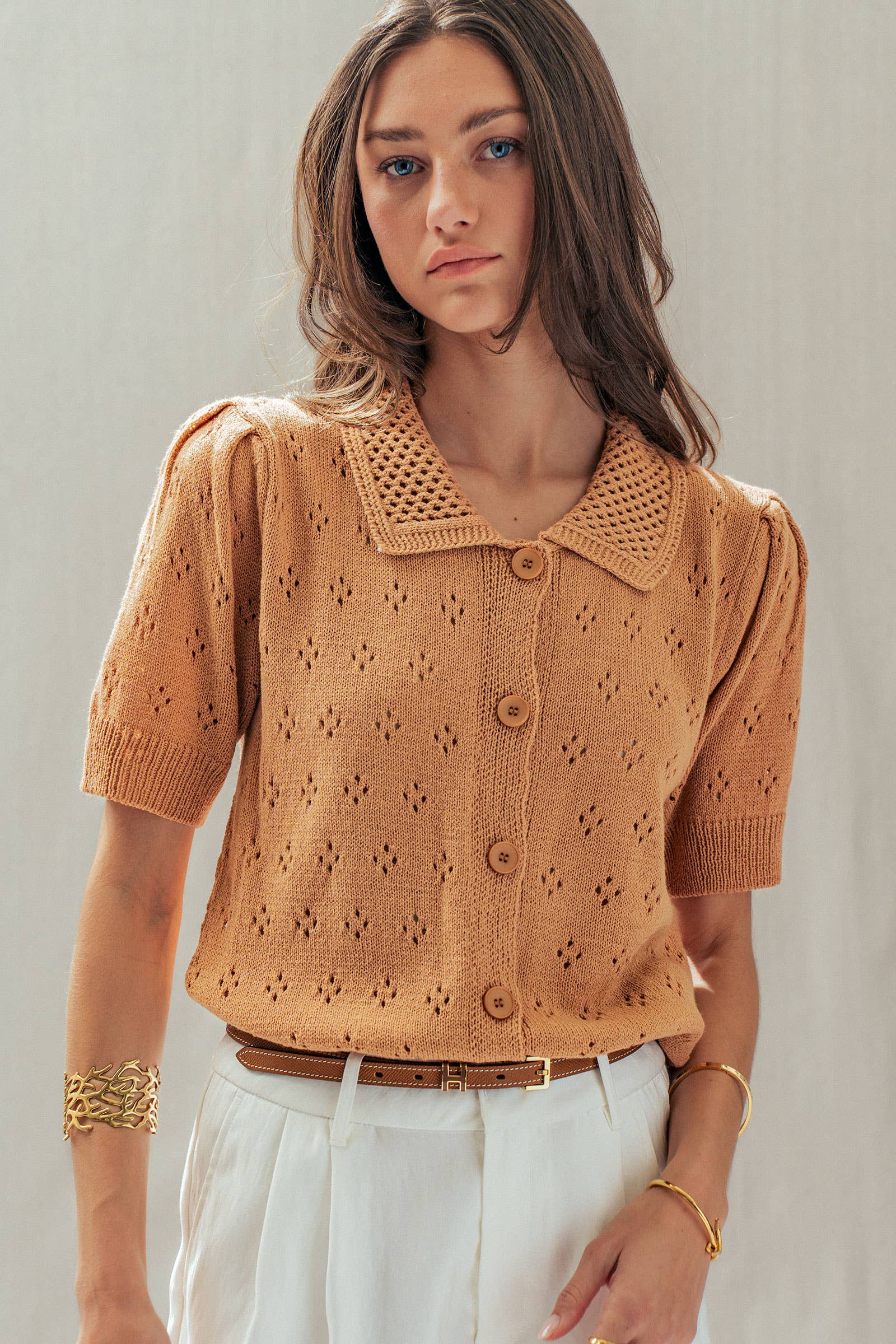 Add a touch of retro charm to your knitwear collection with this vintage-inspired pointelle top. Featuring a warm camel hue and a delicate diamond knit pattern, this short-sleeve cardigan is defined by its textured statement collar and feminine puff sleeves. It’s the perfect transitional piece to wear buttoned as a top or layered over a camisole.