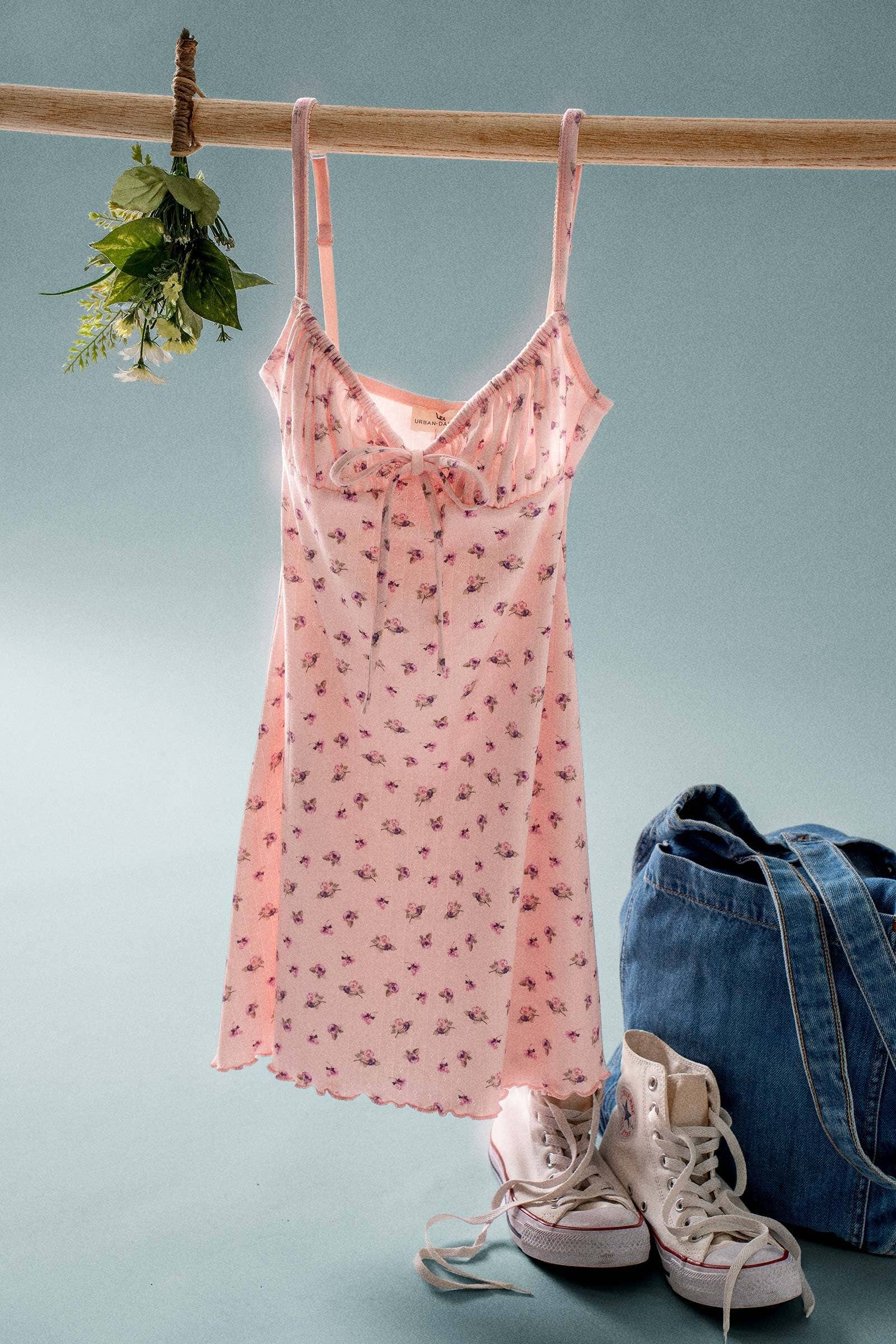 Capture a dreamy garden-inspired aesthetic with this enchanting mini dress. Featuring a delicate pointelle rosebud print on soft ivory fabric, the design exudes romantic charm. It is tailored with a feminine gathered bust, a sweet front tie detail, and an empire waist silhouette that flatters the figure. Finished with adjustable shoulder straps, it offers a perfect customized fit for sunny days.