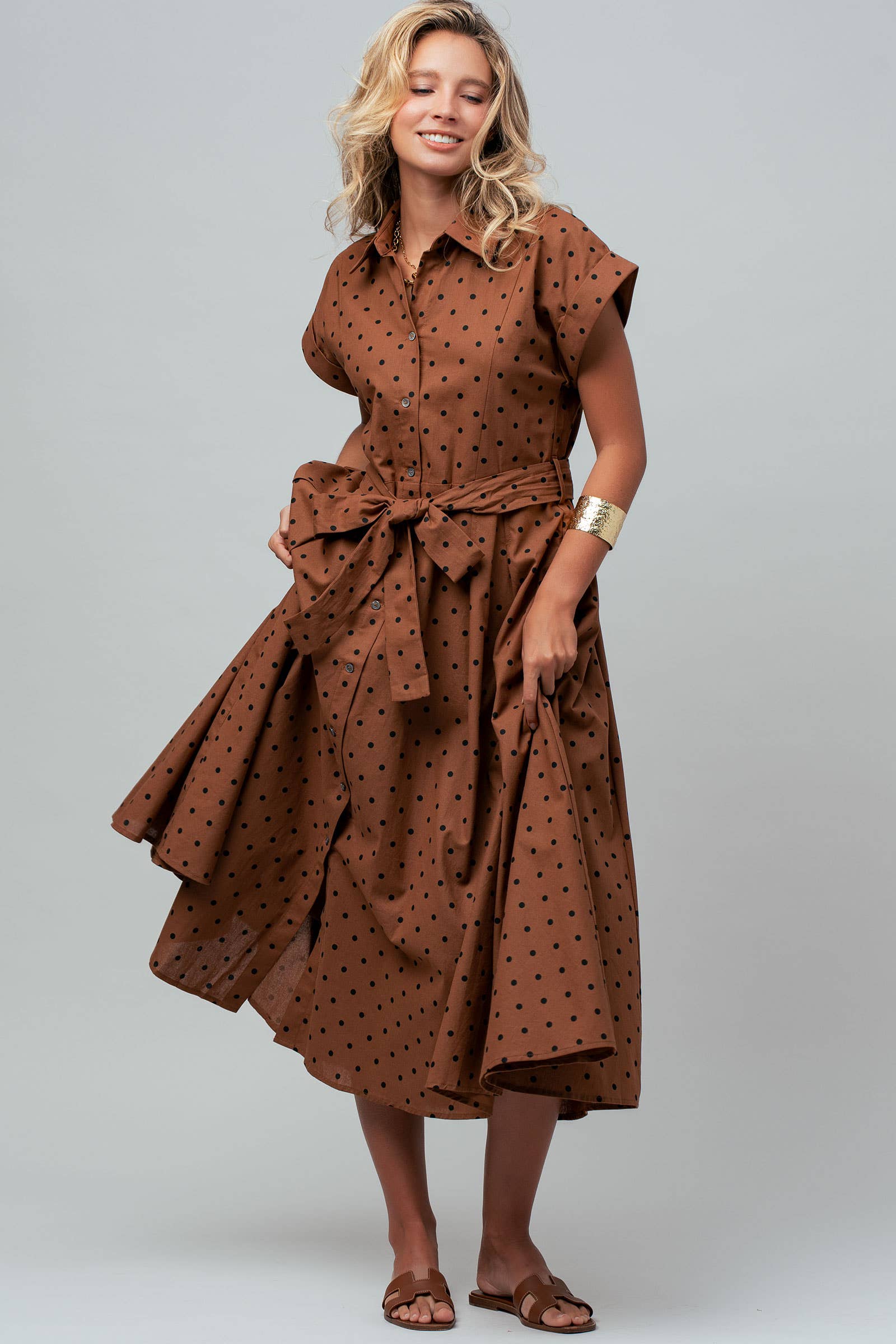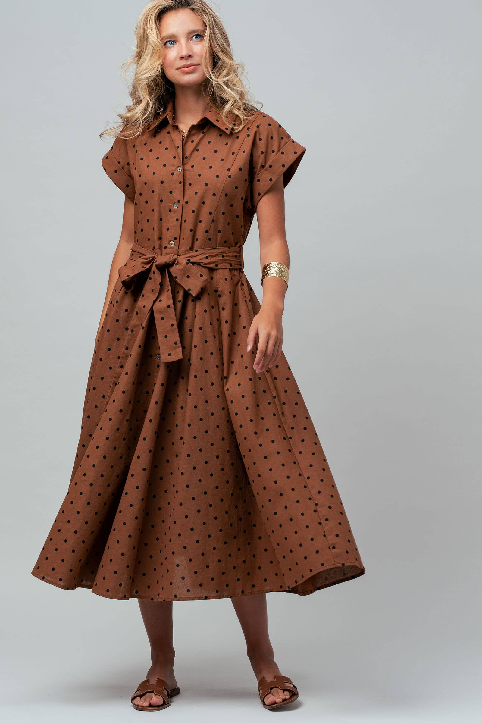 Design: A classic shirt dress with a collar and all-over polka dot print.