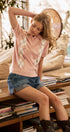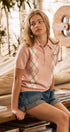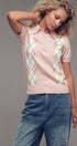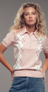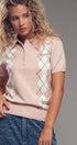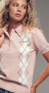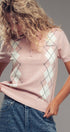 Preppy-inspired short sleeve sweater with a pink base, white argyle pattern, and navy stitch accents. Designed in a slim, slightly cropped fit with stretch for comfort and timeless collegiate style.