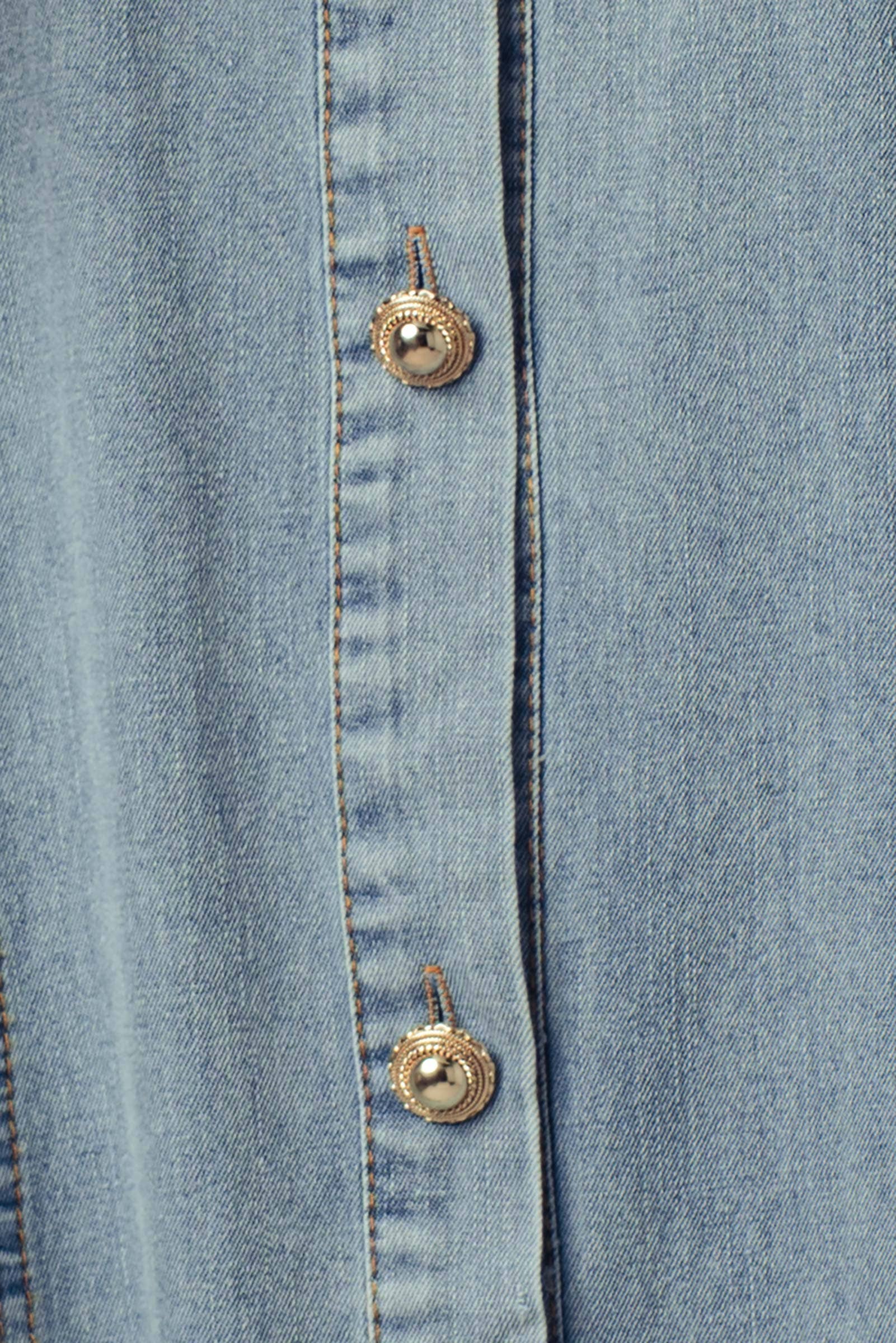 Design: A full button-front shirtdress silhouette in a light-wash denim, featuring dramatic elbow-length puff sleeves.