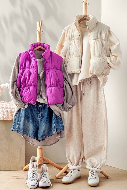 SLEEVELESS STAND COLLAR ZIP UP ELASTIC HEM QUILTED PUFFER VEST WITH SIDE POCKETS S-L:2-2-2 100% NYLON CHINA Discover the perfect blend of warmth and style with our Sleeveless Quilted Puffer Vest - a must-have addition to your wardrobe. Featuring a stand collar and a zip-up front, this sleeveless vest provides a chic and cozy layering option for various occasions. The elastic hem adds a contemporary touch, ensuring a snug and flattering fit that complements your silhouette.