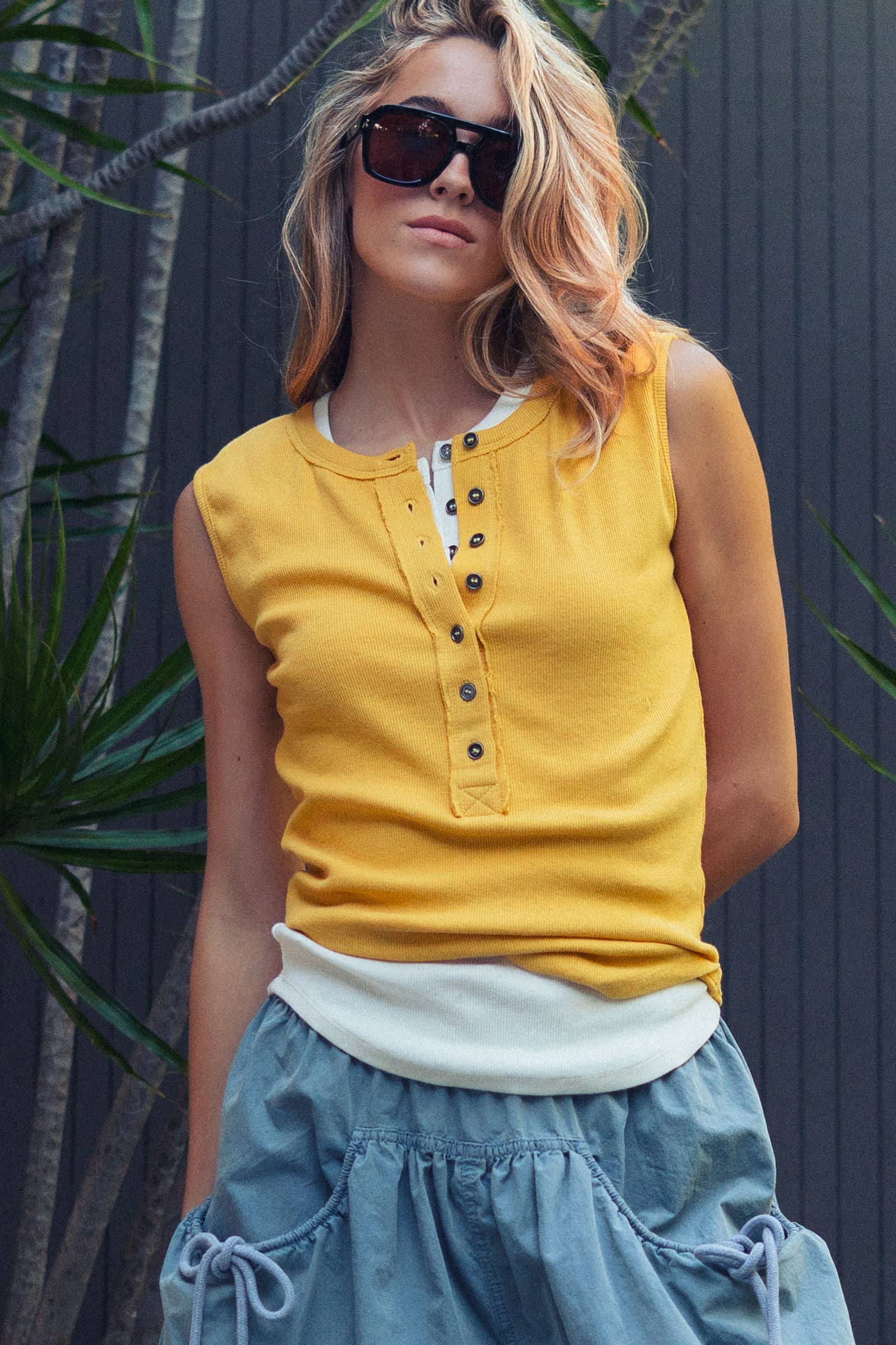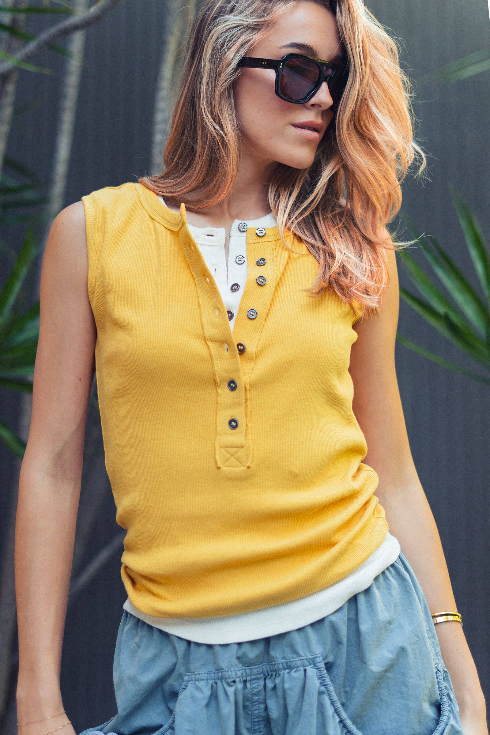 Update your basics with this effortlessly cool ribbed Henley tank, perfect for layering or wearing solo. Crafted from soft 100% cotton with a textured ribbed knit, this sleeveless top features a classic button-front placket and distinctive raw-edge seam details that add a rugged, vintage-inspired appeal. A unique center-back exposed seam and patch detail further elevate the design, while the wide array of available colors—including Royal Blue, Gold, Mint, and Lavender—ensures there is a shade for every mood.