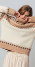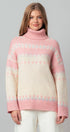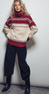 Design: A classic pullover featuring a multi-color Fair Isle jacquard pattern, a chunky turtleneck, and ribbed trim.