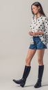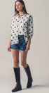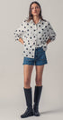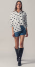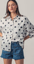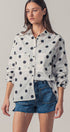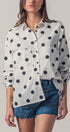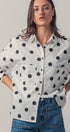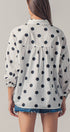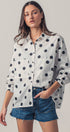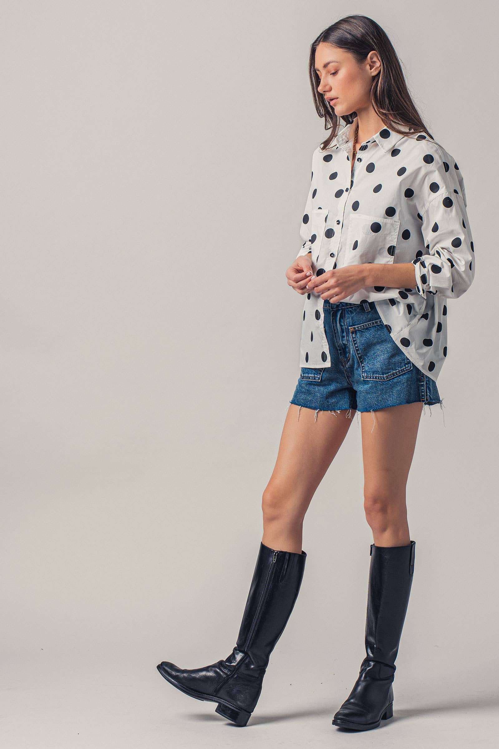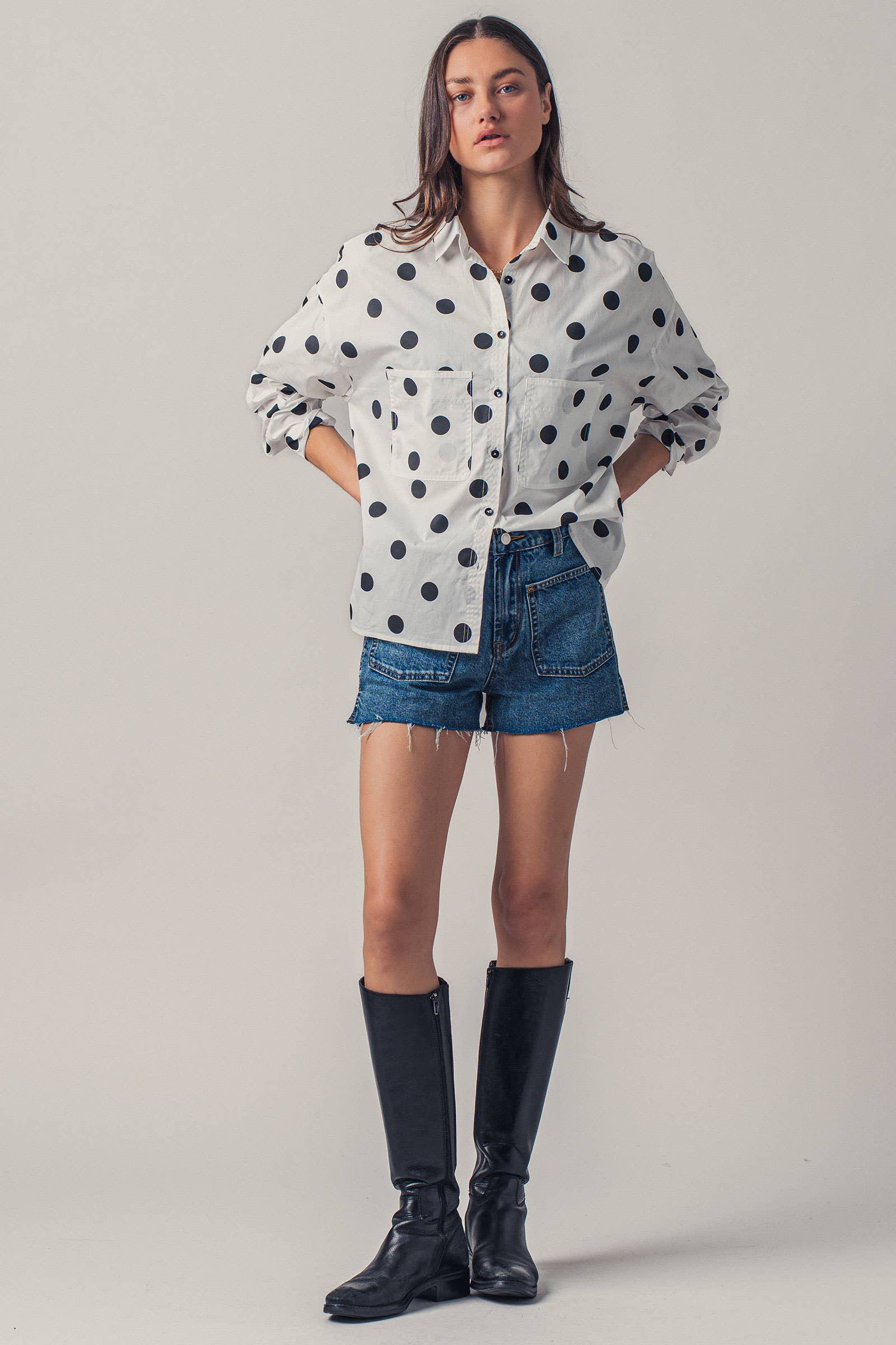 Make a bold graphic statement with this playful button-down shirt, featuring a classic black polka dot pattern on a crisp white background. Crafted from breathable 100% cotton, the design offers a trendy oversized fit with drop shoulders and long sleeves that can be easily rolled for a casual look. Functional details include two large patch pockets on the chest and a back yoke with gathered pleating to create a comfortable, flowy drape.