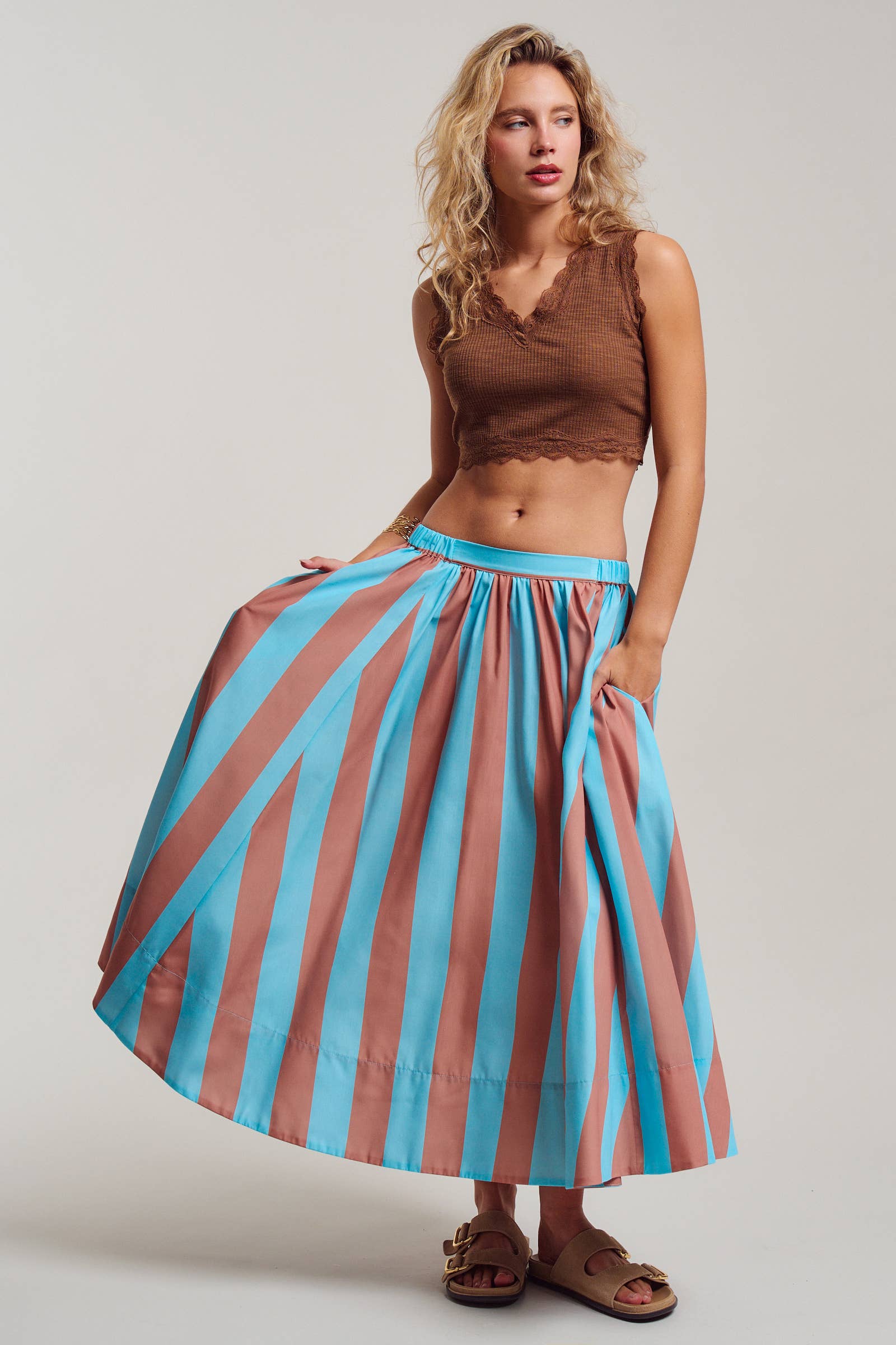 Make a geometric statement with this bold retro-inspired maxi skirt. Featuring a striking chevron stripe pattern in vibrant aqua blue and earthy rust brown, this skirt captures the essence of 70s resort style. Designed with a voluminous A-line sweep and a comfortable elastic waistband, it pairs effortlessly with a simple tank or the matching crop top for a complete look.