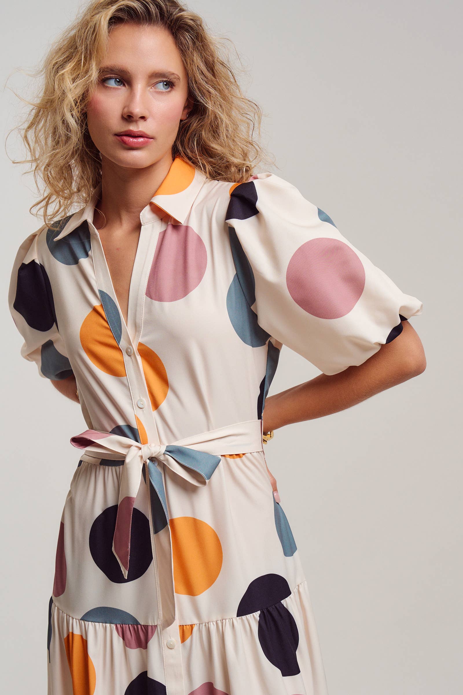 Print: Features a bold, large-scale polka dot print in multi-colored earth tones (terracotta, dusty rose, slate blue, and navy) on a cream base.