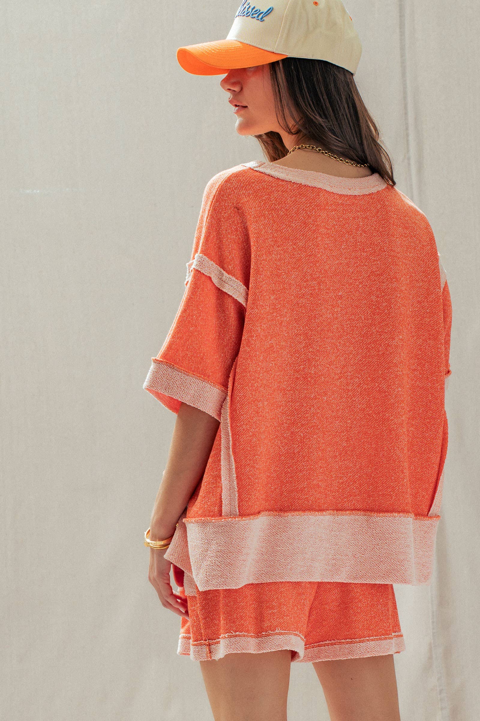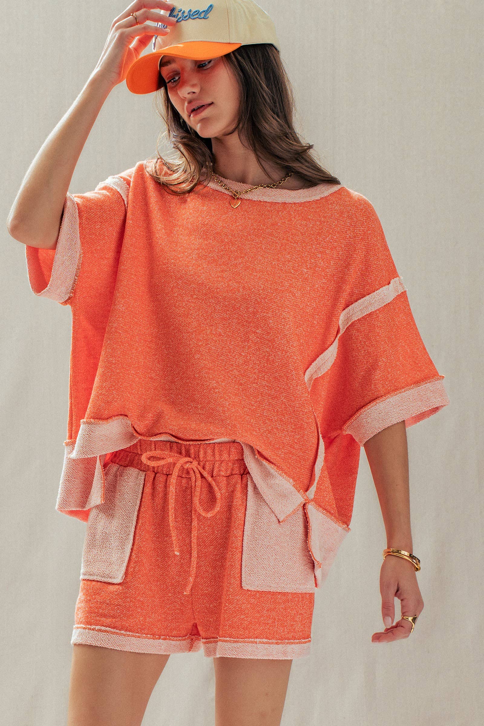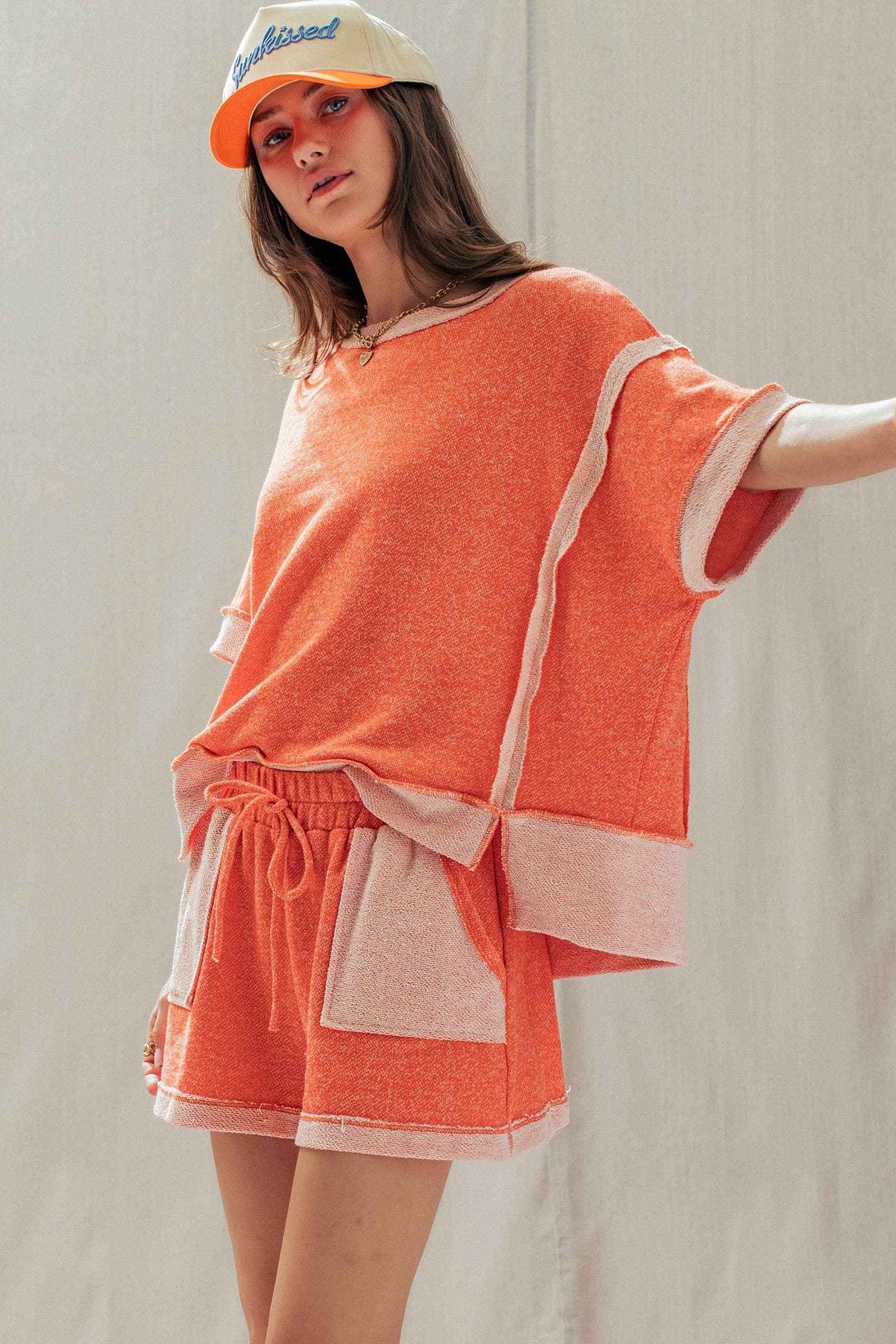 Top Design: A relaxed, boxy short-sleeve tee featuring dropped shoulders and trendy exposed raw seams that frame the silhouette.