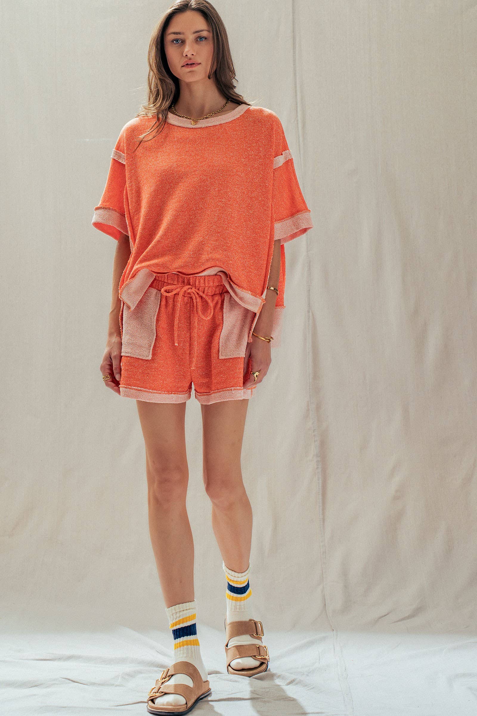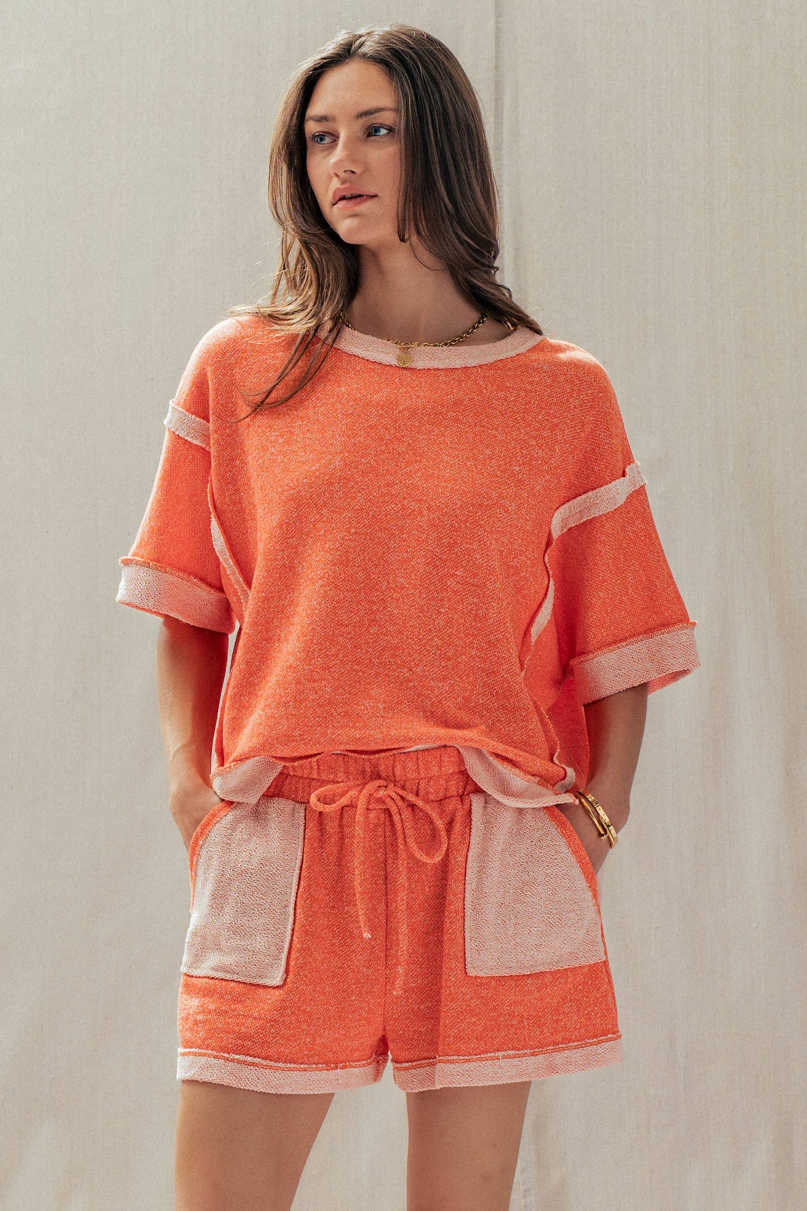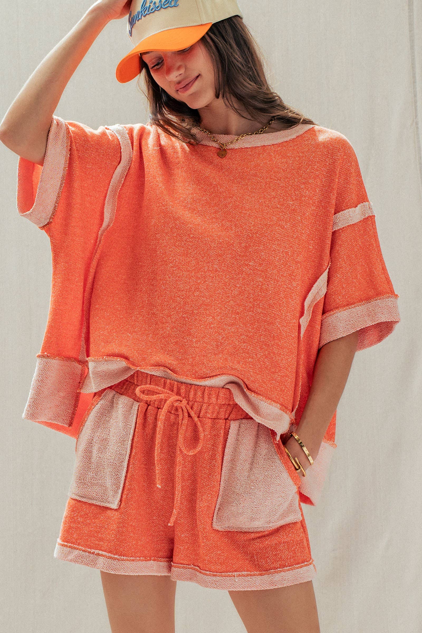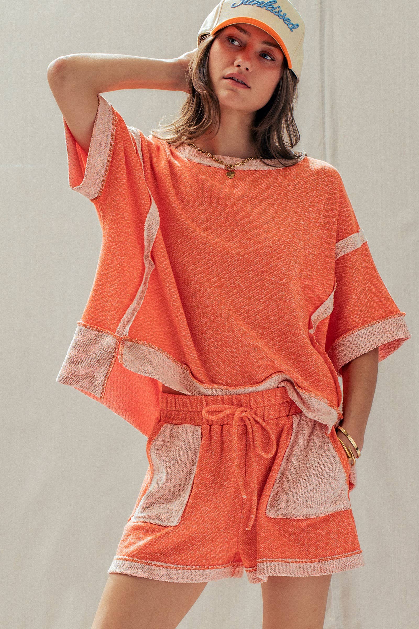 Top Design: A relaxed, boxy short-sleeve tee featuring dropped shoulders and trendy exposed raw seams that frame the silhouette.
