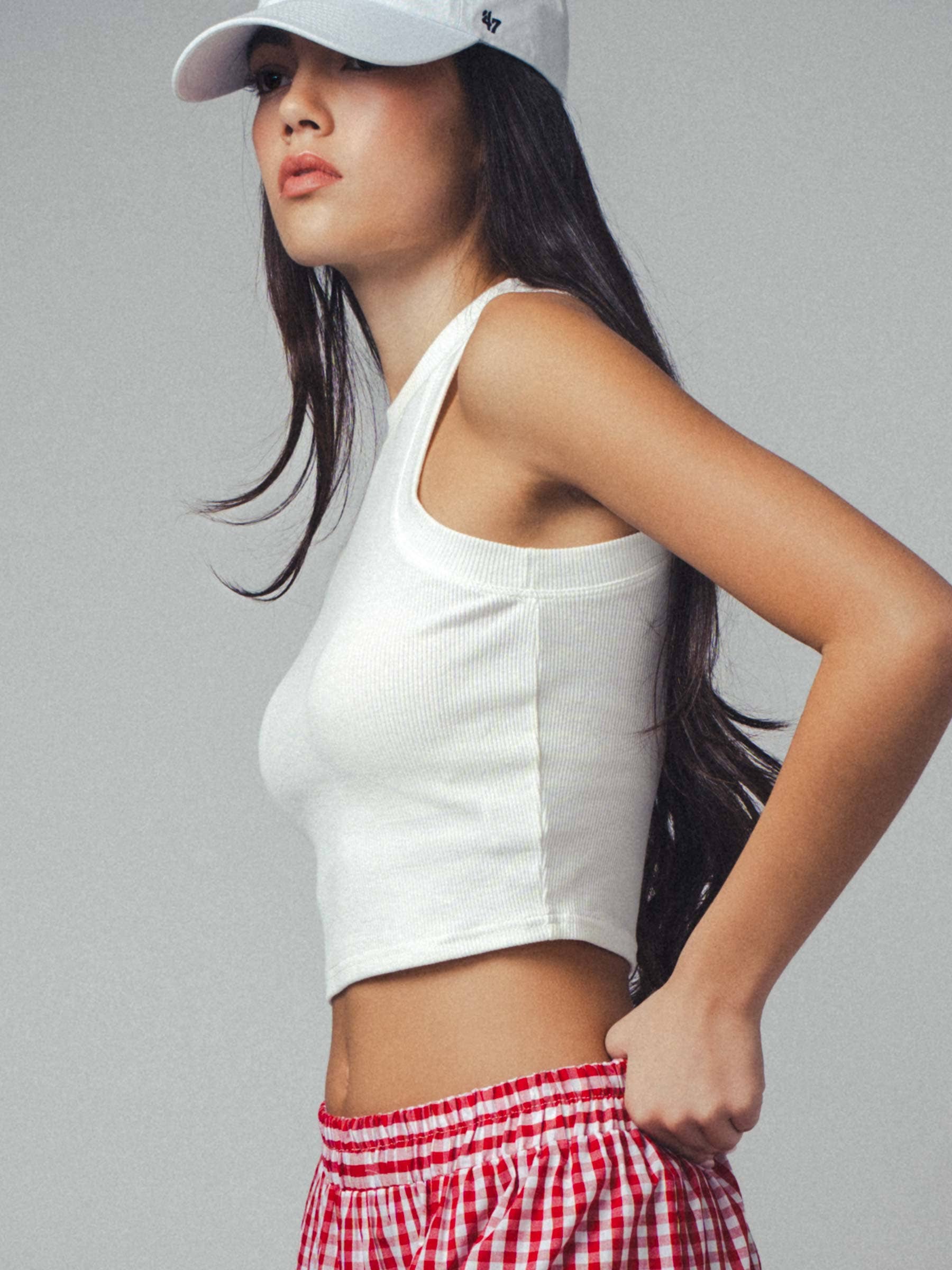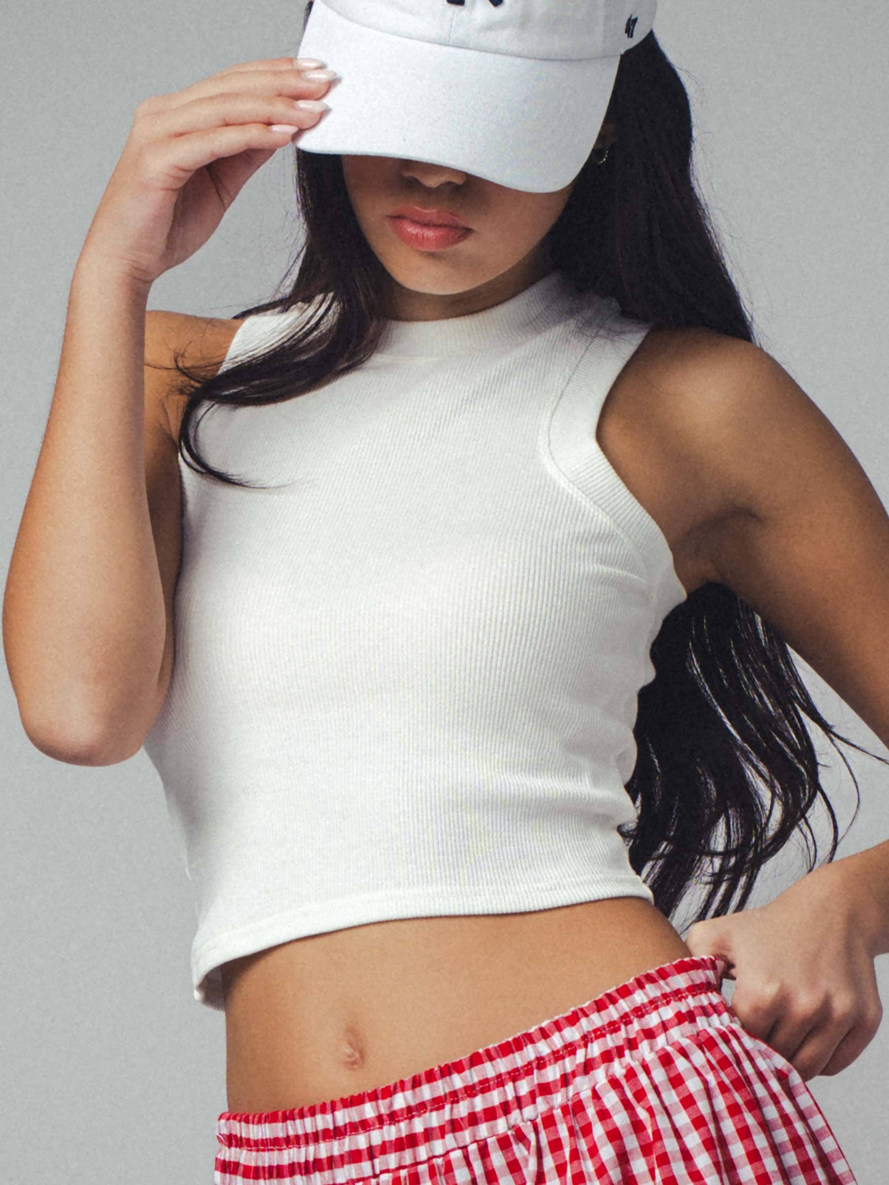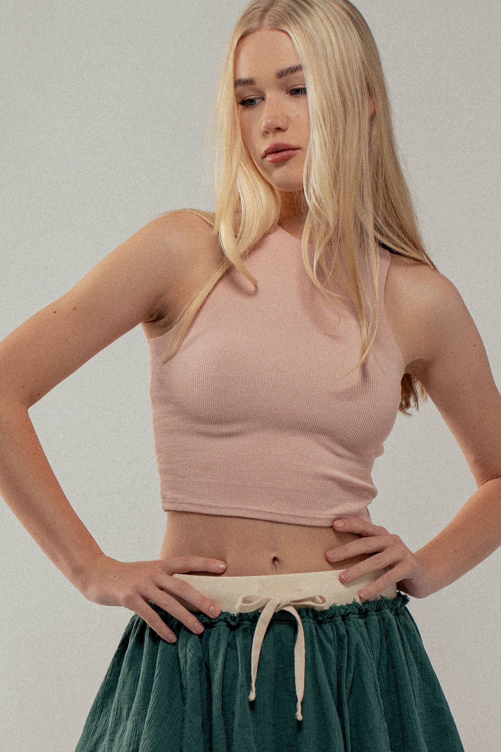 This ribbed knit halterneck tank top features a sleeveless design and a cropped silhouette, offering a flattering and comfortable fit. Perfect for casual outings or layering, it’s crafted from lightweight, breathable fabric for all-day wear.