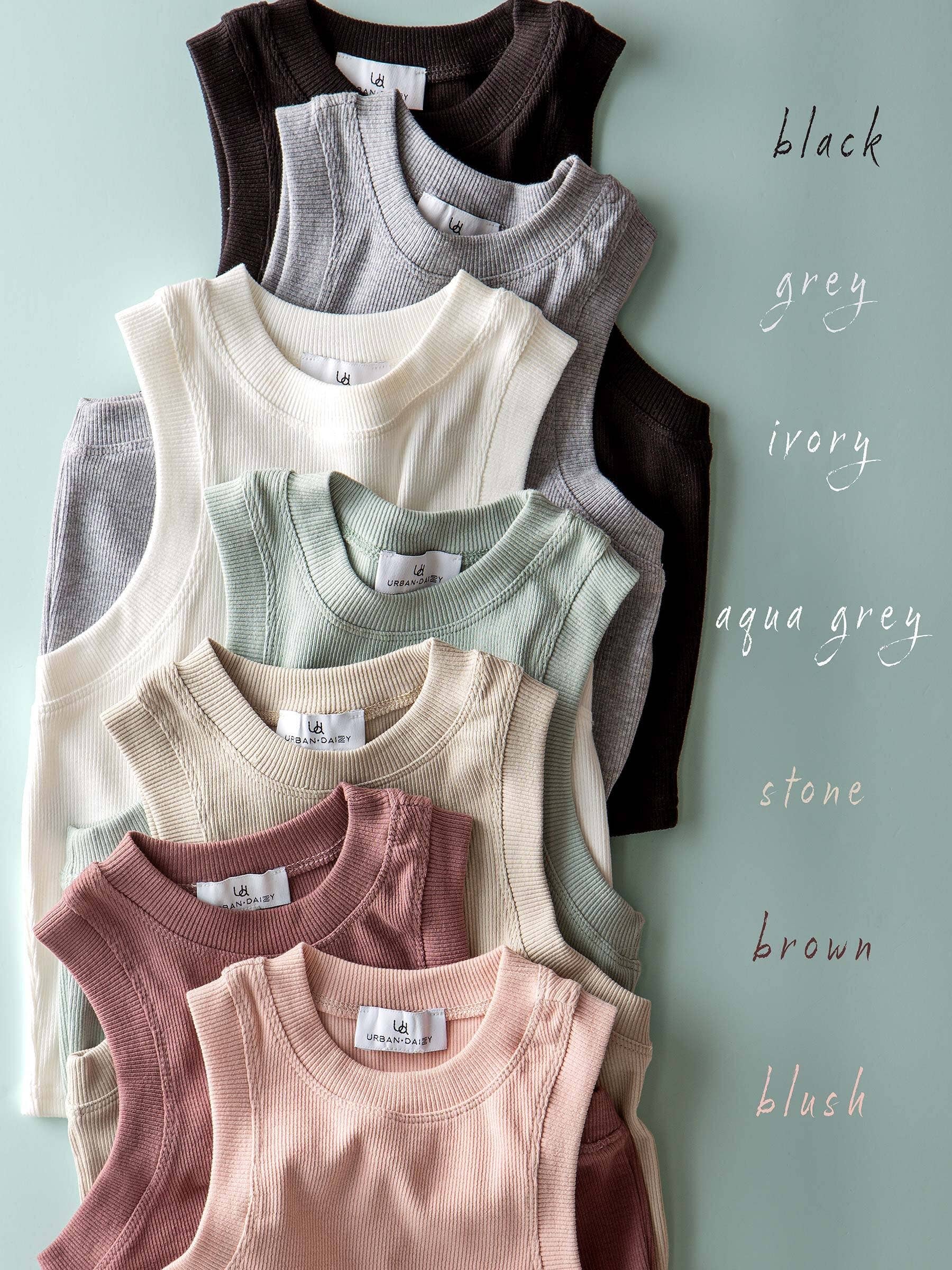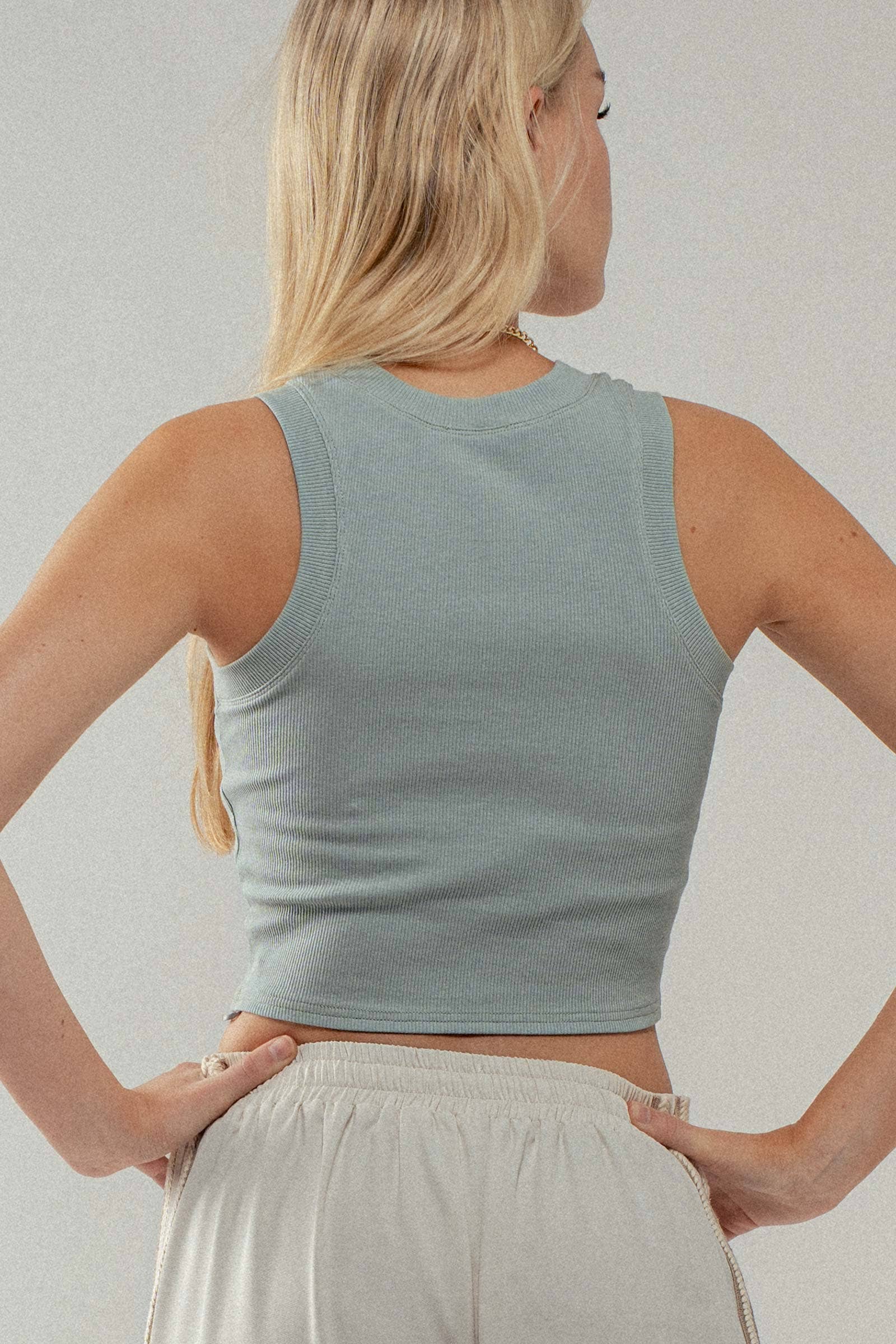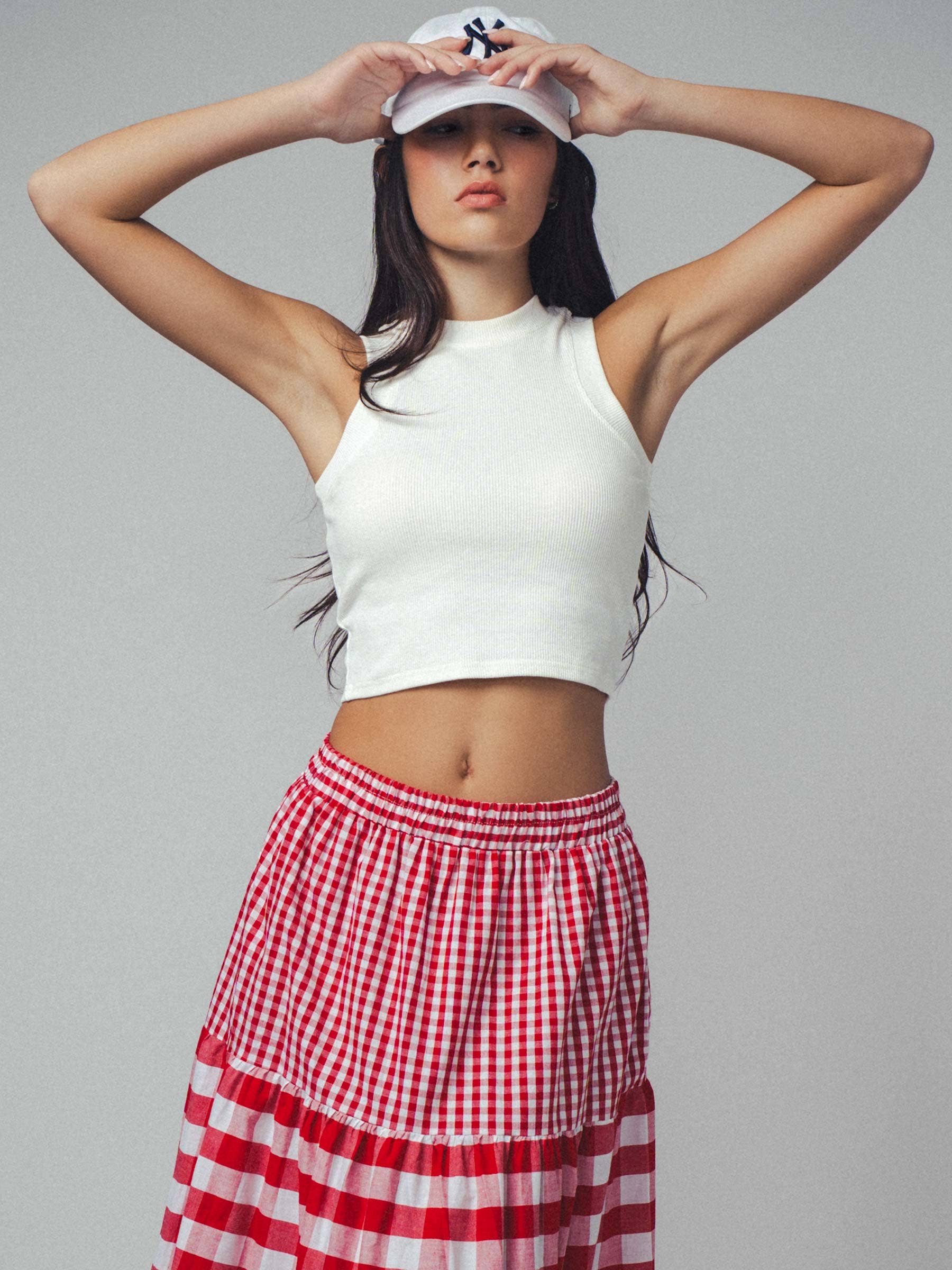 This ribbed knit halterneck tank top features a sleeveless design and a cropped silhouette, offering a flattering and comfortable fit. Perfect for casual outings or layering, it’s crafted from lightweight, breathable fabric for all-day wear.