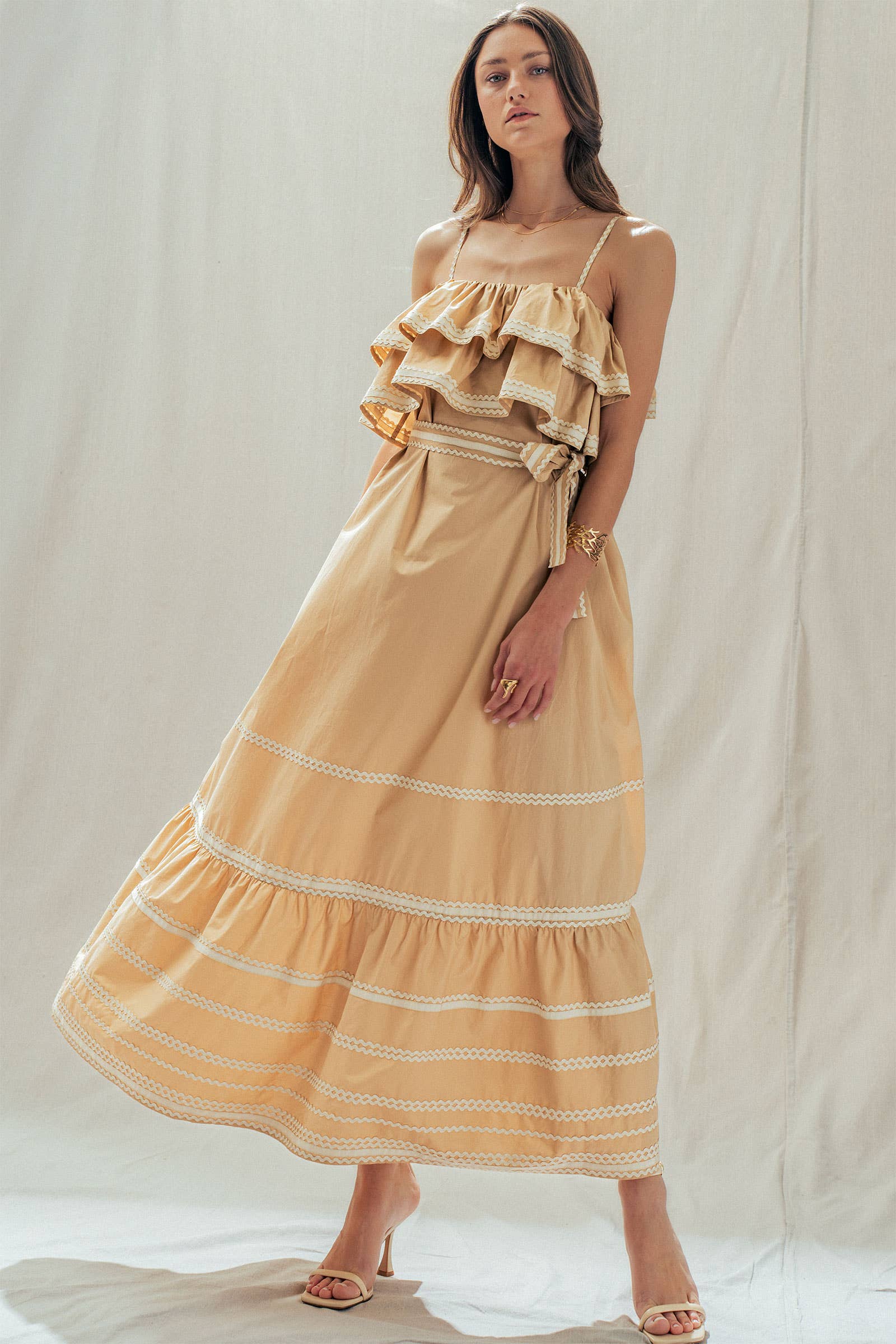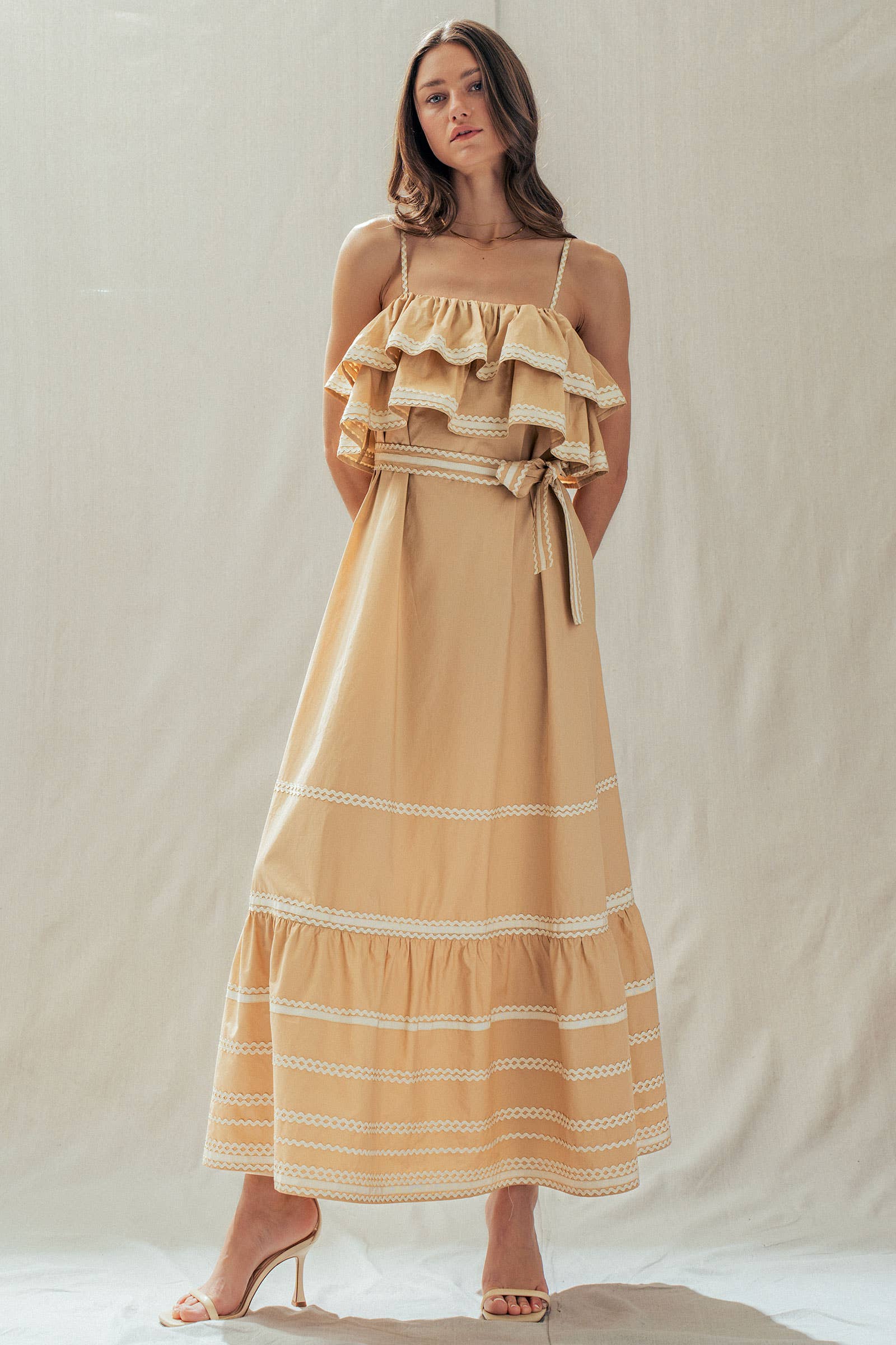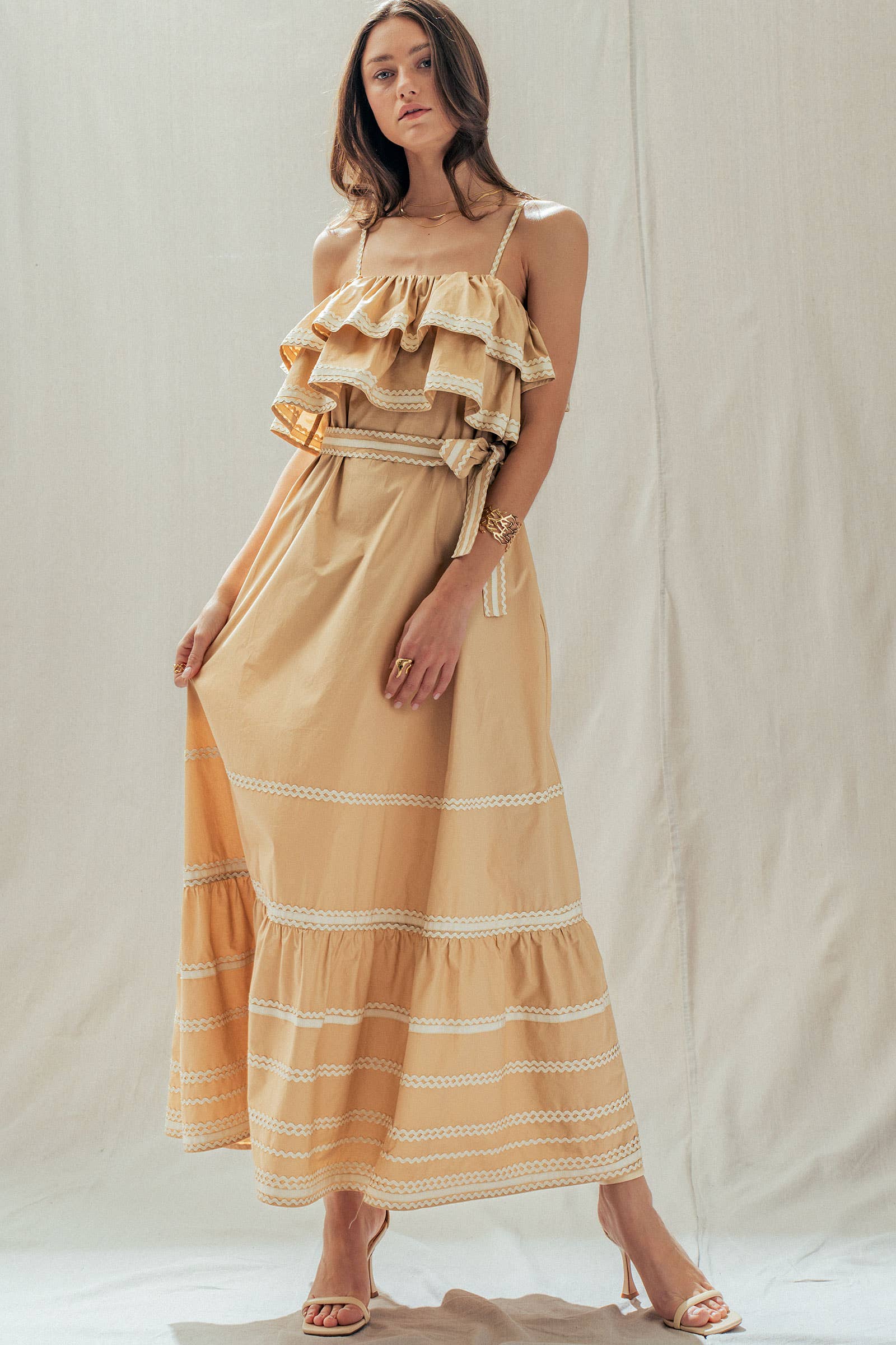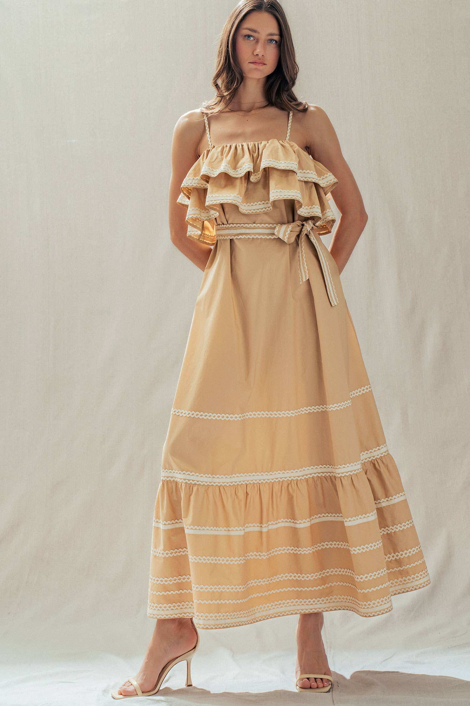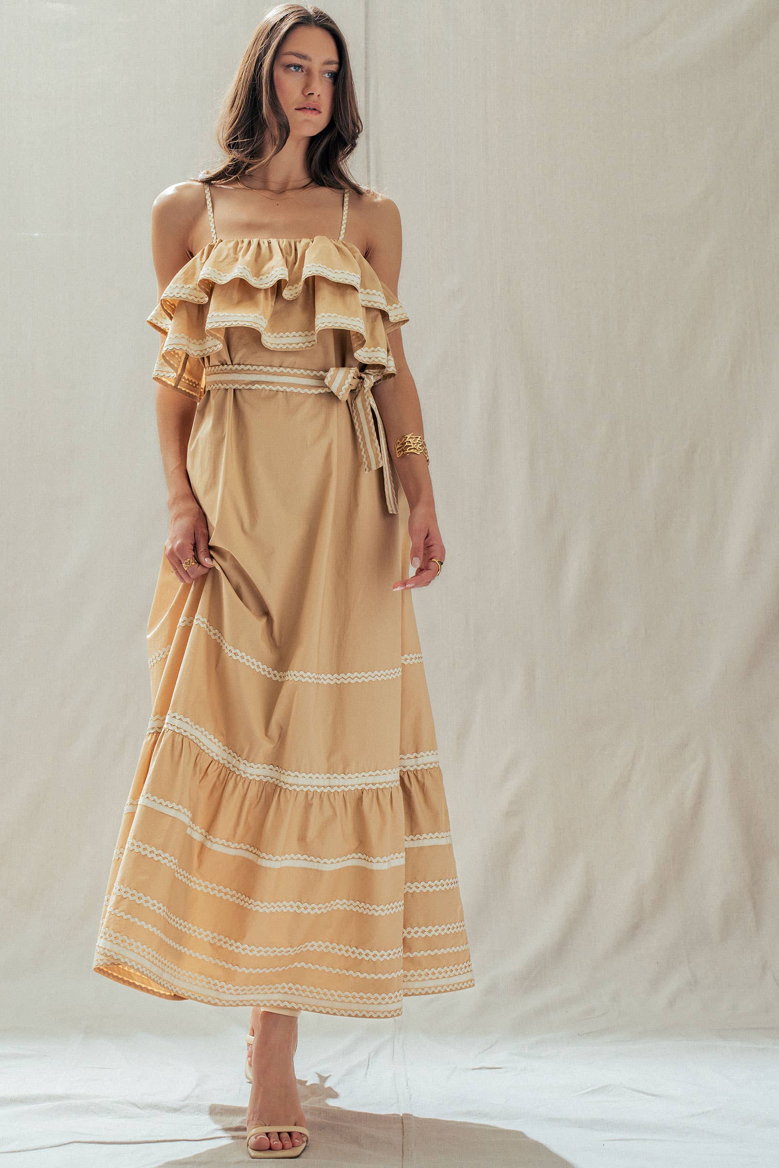 Make a dramatic entrance with this vintage-inspired cotton maxi dress. Defined by voluminous tiered ruffles and playful contrast rickrack trim, this sun-drenched camel dress features a flattering belted waist and a sweeping skirt—perfect for golden hour photos or seaside dinners.