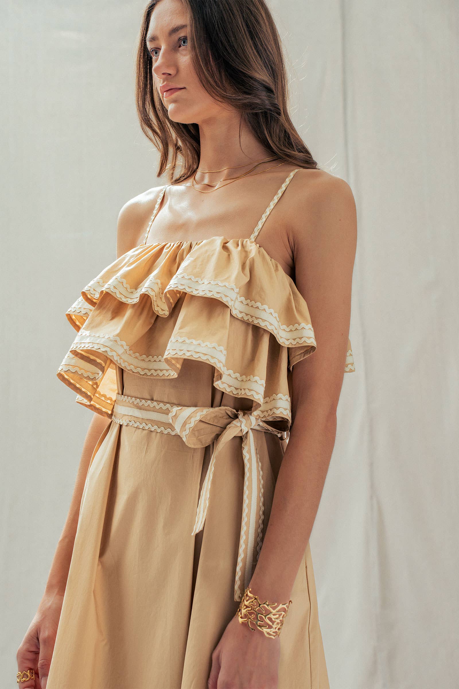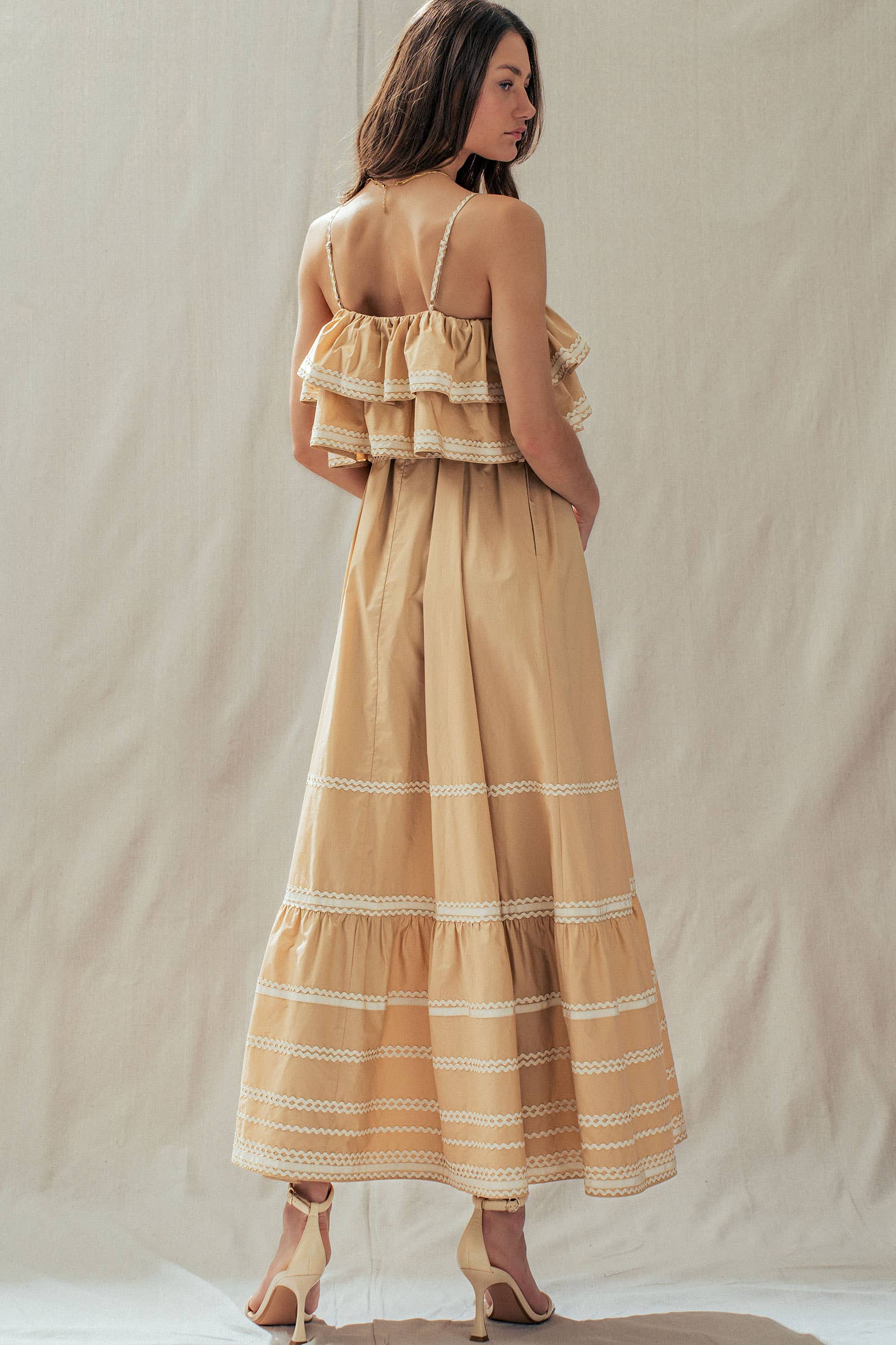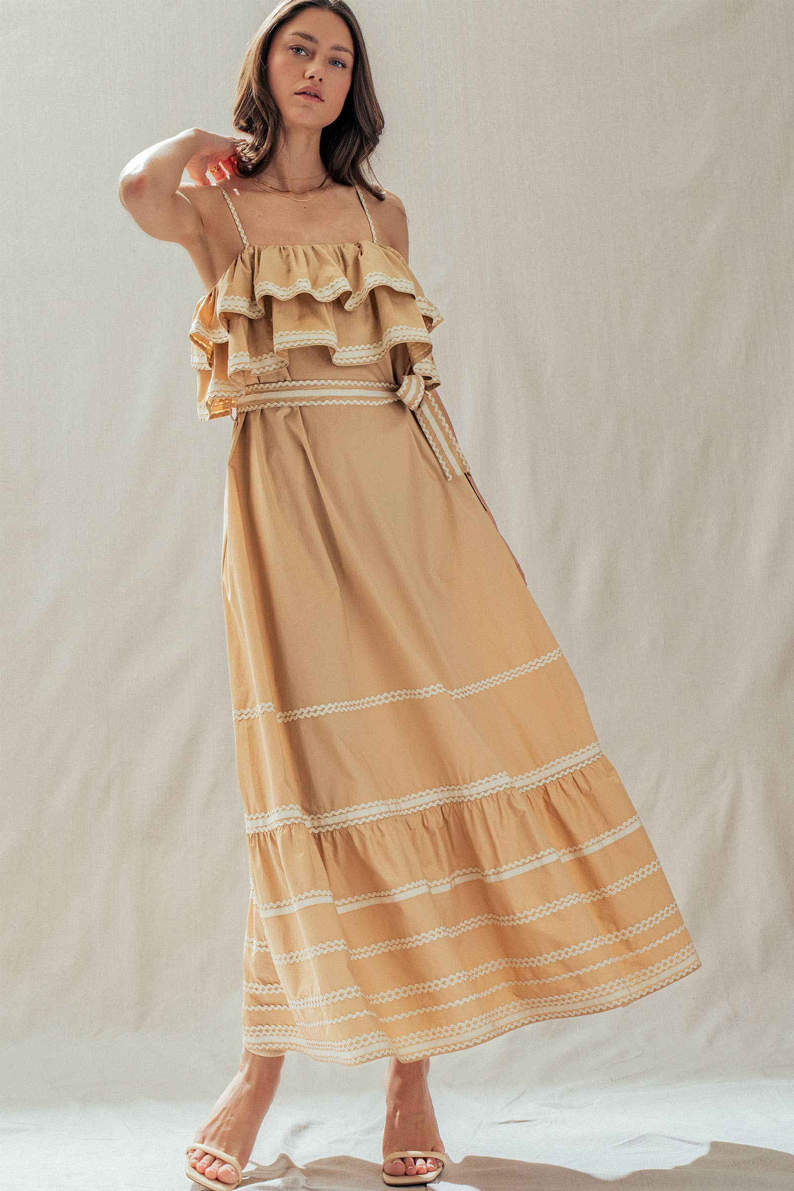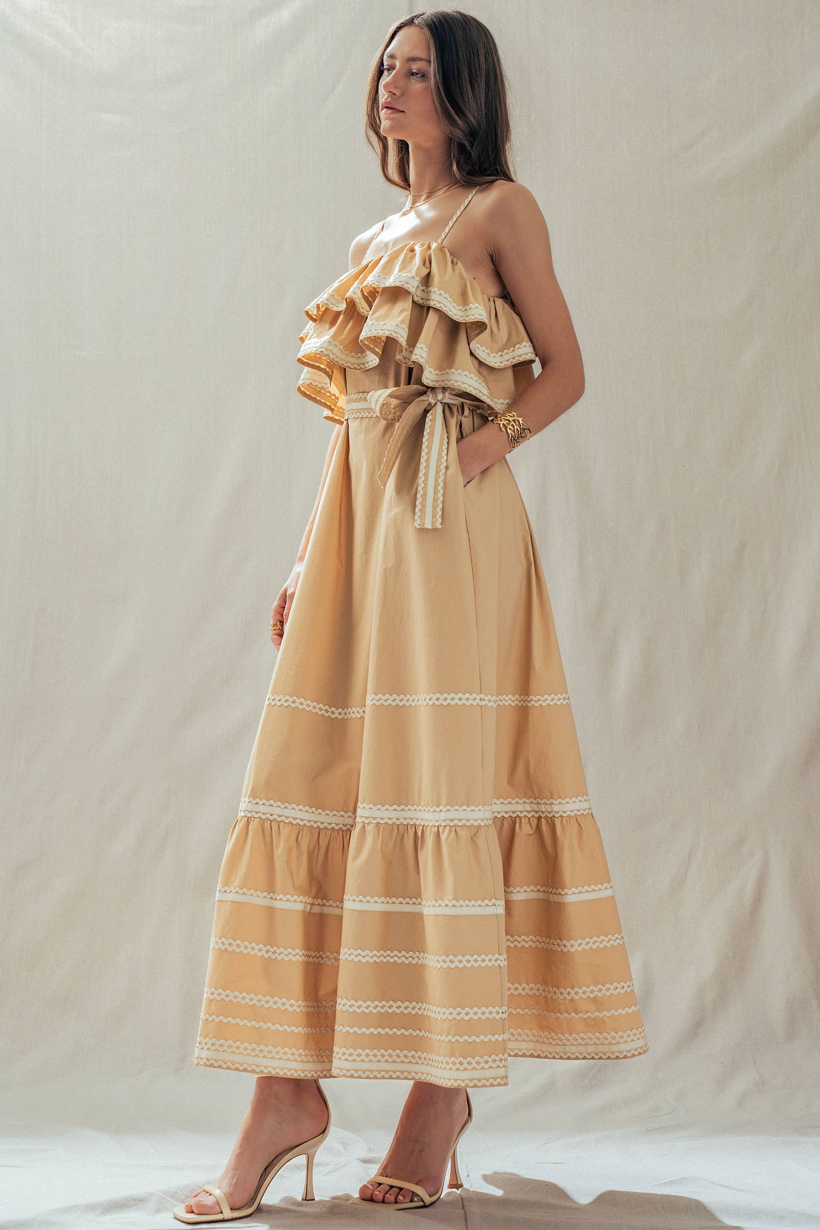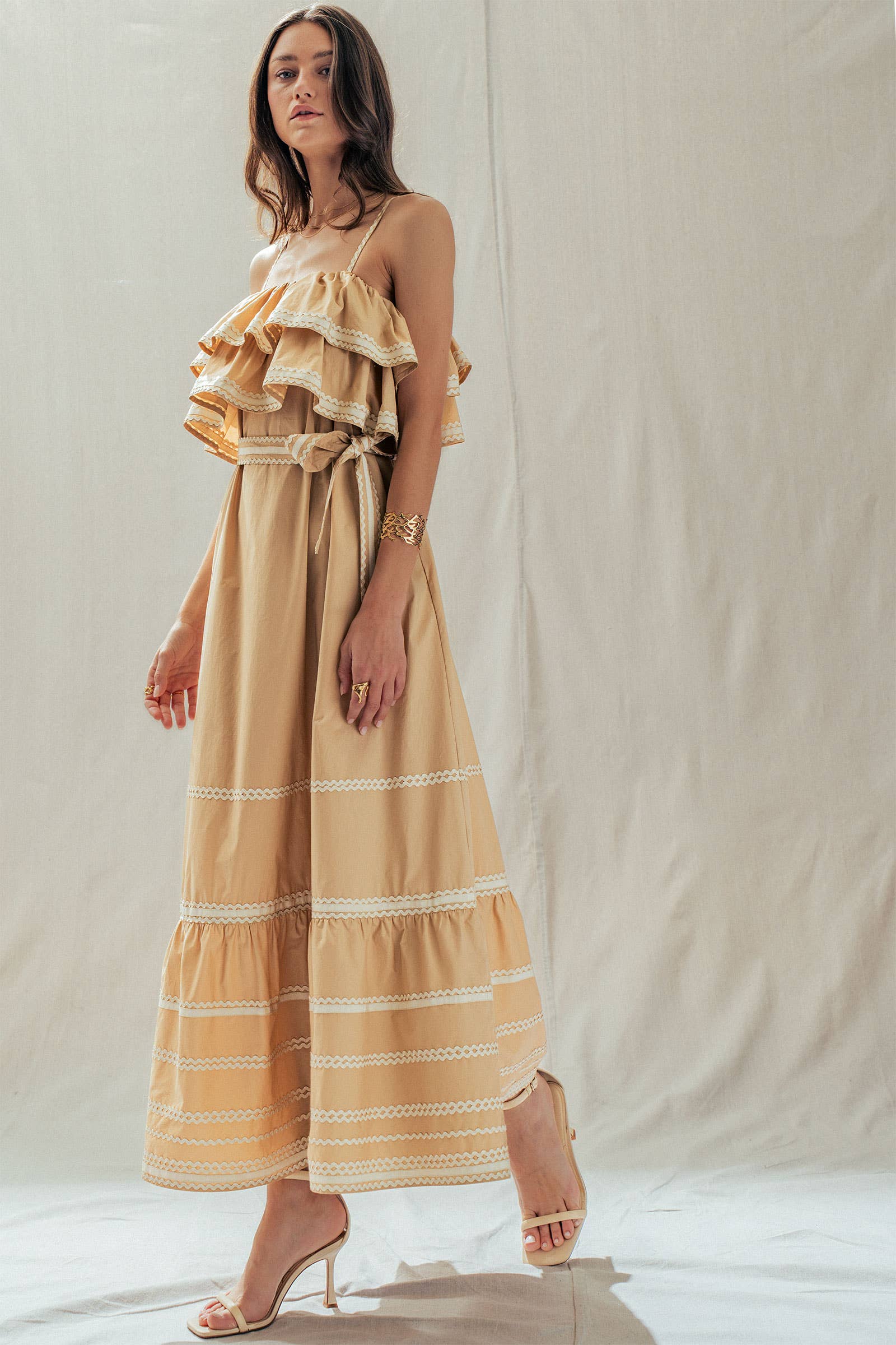 Make a dramatic entrance with this vintage-inspired cotton maxi dress. Defined by voluminous tiered ruffles and playful contrast rickrack trim, this sun-drenched camel dress features a flattering belted waist and a sweeping skirt—perfect for golden hour photos or seaside dinners.