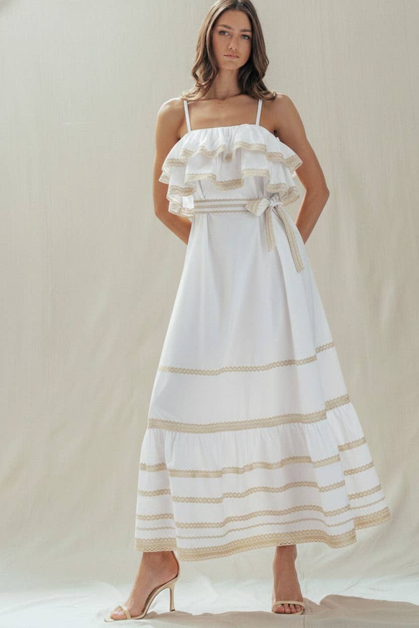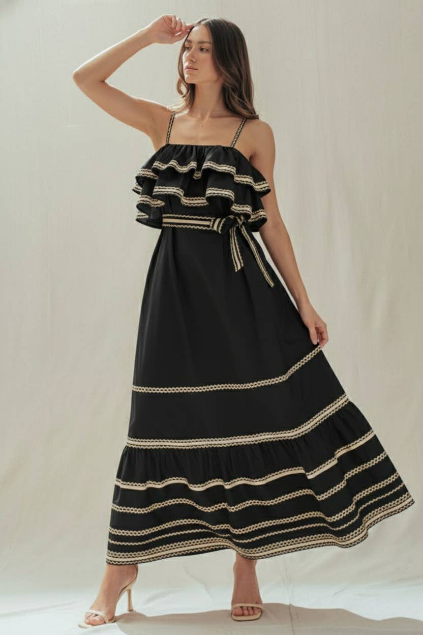 Rickrack Trim Tiered Ruffle Cotton Maxi Dress