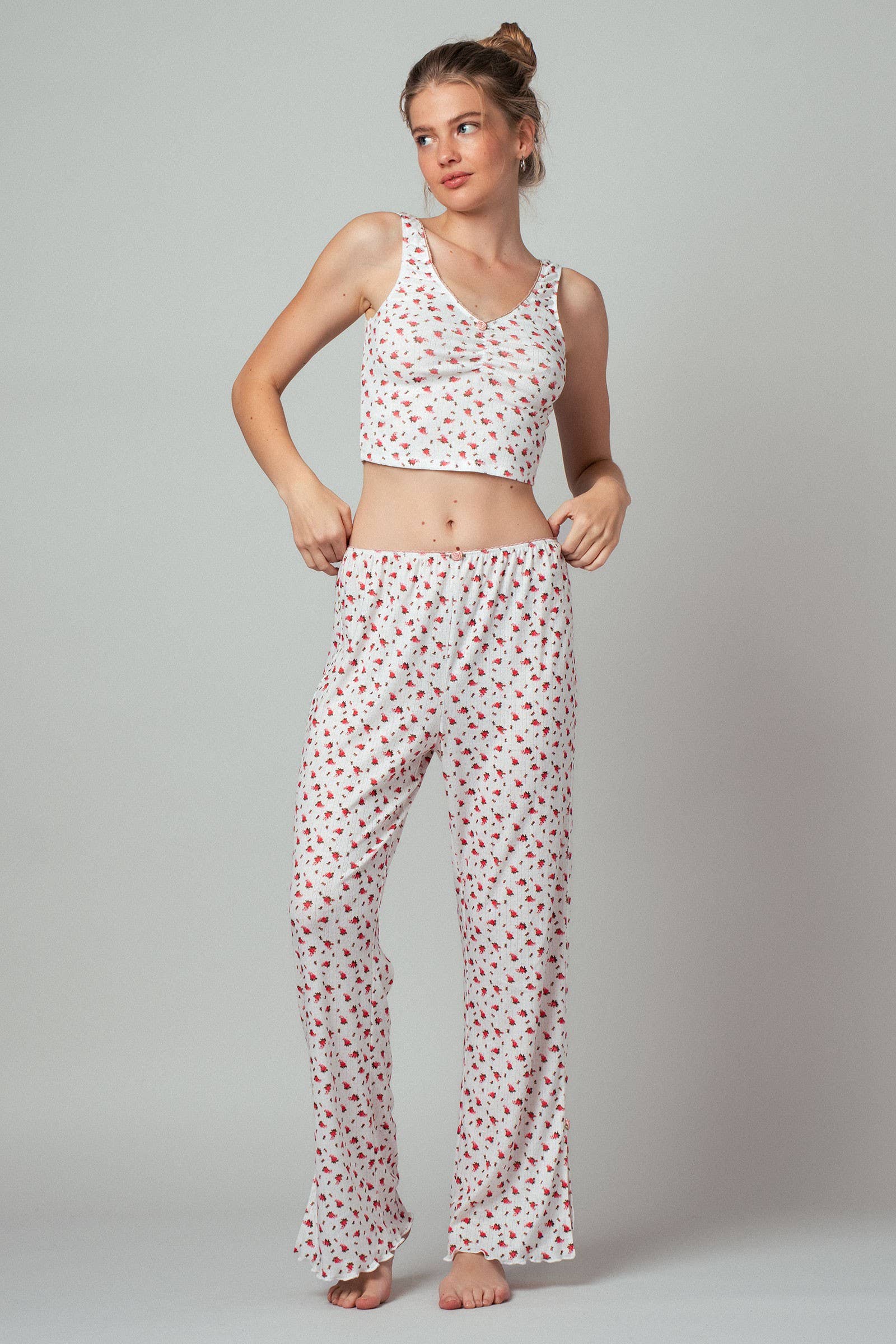 Delicate red roses bloom on an ivory backdrop in this romantic cropped tank, offering a sweet, vintage-inspired aesthetic. Designed with gathered ruching and delicate picot trim, it provides the perfect feminine touch for spring outfits, resort days, or laid-back weekend layering.